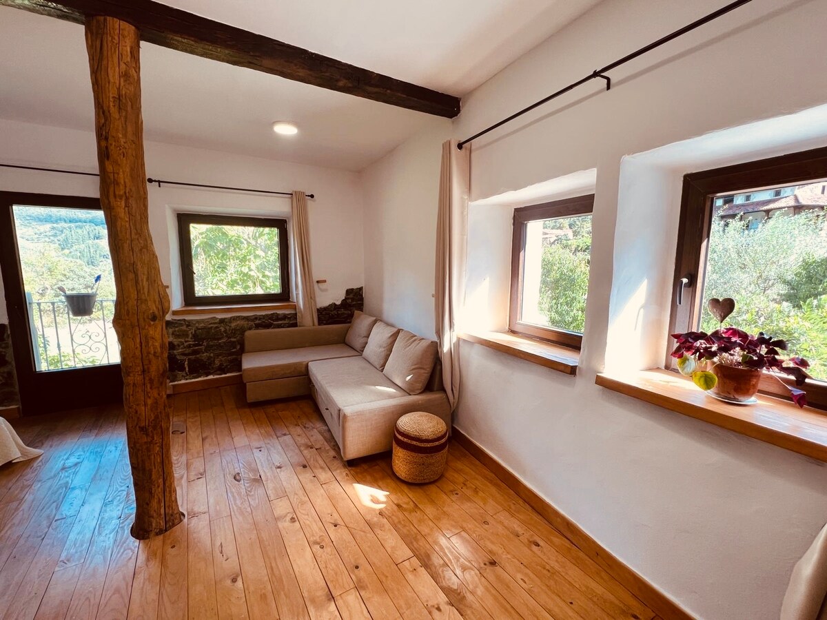 Encantadora suite rural de 50 m² con vigas de madera a la vista, con impresionantes vistas a las montañas. A la llegada de los días soleados, disfrute plenamente de la terraza elevada de madera: un espacio suspendido entre el cielo y el valle, perfecto para disfrutar de un café al amanecer, compartir una copa frente al atardecer, o preparar una deliciosa barbacoa al aire libre mientras respira la tranquilidad de la naturaleza de los alrededores.