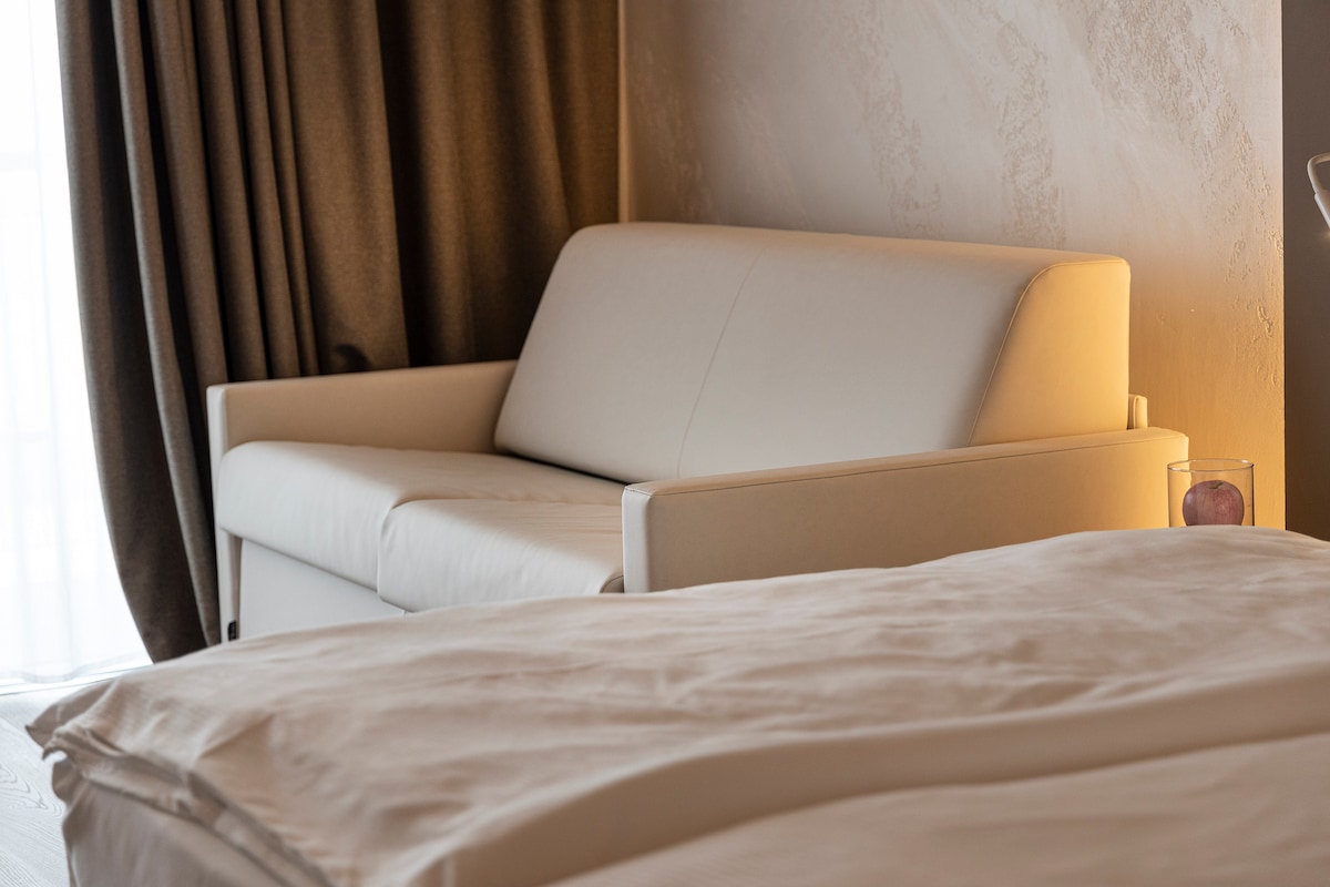 Suite Junior exclusiva en un hotel boutique de bienestar a pocos pasos del lago de Garda. ¿Lo mejor? Una bañera de hidromasaje privada en la terraza para relajarte al aire libre. Diseño elegante, una acogedora cama tamaño king, baño moderno con ducha espaciosa y un rincón de té y café. Un refugio íntimo donde la comodidad, el bienestar y el romance se unen para ofrecerte una estadía inolvidable.