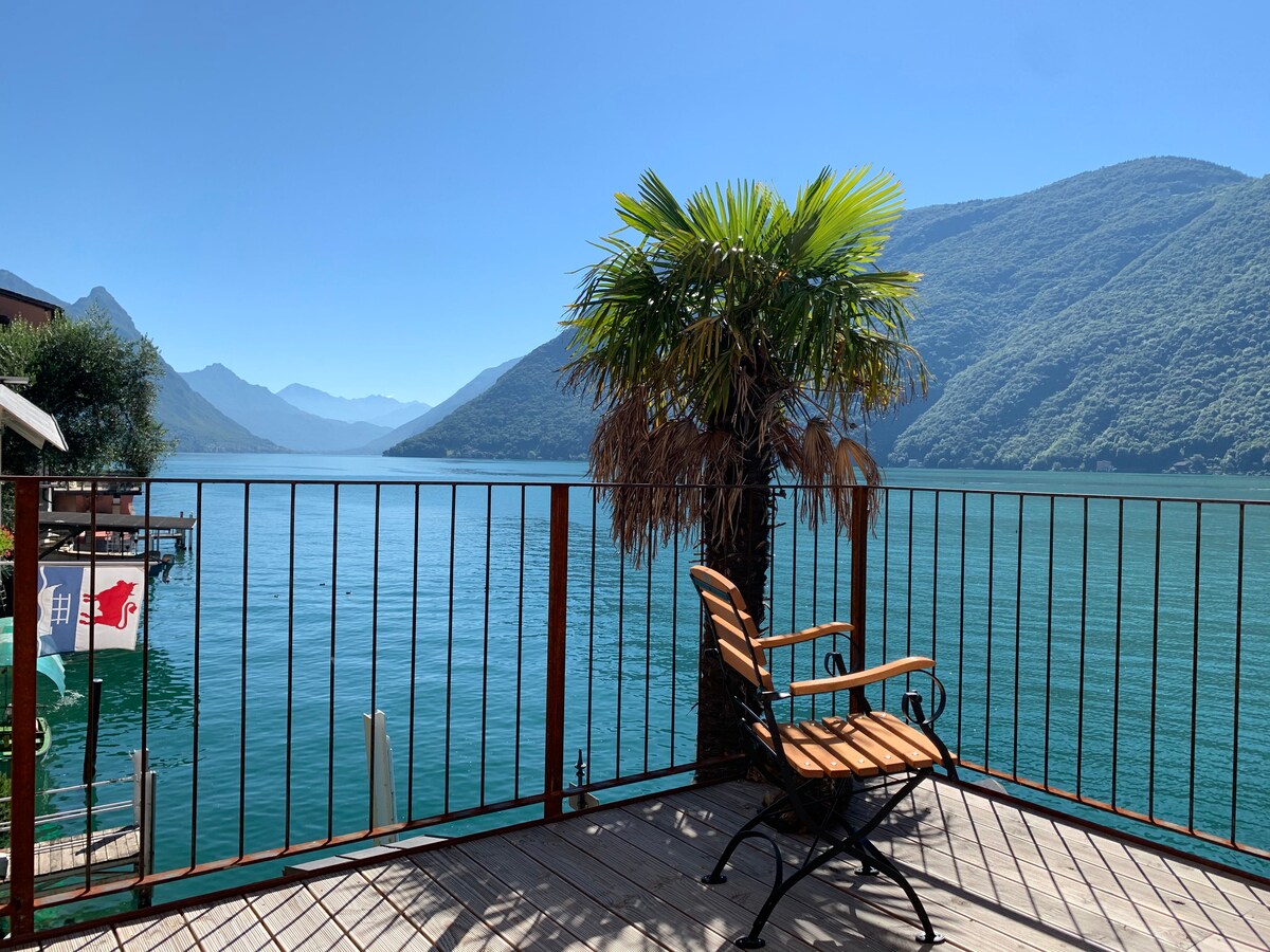 Die Maisonettewohnung mit grosser Terrasse liegt in Gandria direkt am Ufer des Lago di Lugano. Die Sicht und der direkte Zugang zum See verzaubert zu jeder Jahreszeit. Die Wohnung besitzt einen eigenen Eingang mit direktem Zugang in die offene Küche und Wohnzimmer mit Kamin und Aussicht zum See. Bei schönem Wetter verweilen unsere Gäste auf der Terrasse zum See oder genießen den Schatten im Innenhof. Alle Schlafzimmer haben Blick zum See. Cafes und Restaurants sind nebenan.