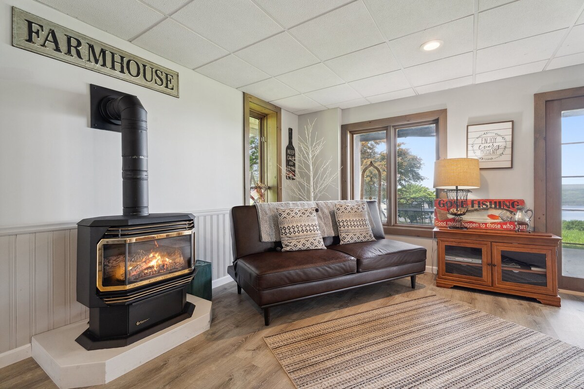 *The host has covered 100% of the guest Airbnb fees on this 90 ft of private lake front property* Have dinner on the screened in porch while watching the sunset. Roast marshmallows by the fire pit. Jump off the dock and swim in fresh water or float alongside on the kayaks provided. Take a wine tour by boat. Hike trails and see the waterfalls at our local state parks. Rent a boat from the marina next door. For couples, families, friends, and water enthusiasts, this has it all!