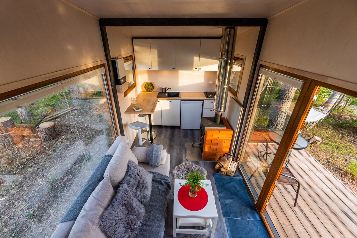 Construida en 2017, esta casa de madera privada de 60 m2 a prueba de invierno tiene 1 dormitorio con cama de matrimonio y una gran sala de estar con cocina abierta. También hay una sauna eléctrica y una terraza que se abre a un prado que se está recuperando naturalmente en un bosque. Mucha luz natural, aire acondicionado, suelos radiantes, una cocina totalmente equipada, sauna y wifi 4G proporcionarán una estancia cómoda y relajante en todas las estaciones. Hay un cargador de vehículos eléctricos de 22 kW a tu disposición, alimentado por electricidad 100 % renovable.