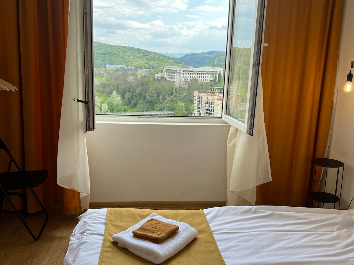 Bienvenido a nuestro estudio recién reformado en el sexto piso de la icónica Torre Balcánica en el corazón de Gabrovo. El estudio ofrece aparcamiento privado. Disfruta de las hermosas vistas de la ciudad y Yantra desde nuestro acogedor apartamento, ubicado a solo unos pasos de la Universidad, restaurantes y una tienda abierta las 24 horas, los 7 días de la semana. El estudio se encuentra en el centro de la ciudad, a solo 5 minutos a pie del Museo de la Sátira, a 10 minutos en coche del Museo Etnográfico al aire libre Etar y a 30 minutos de la estación de esquí de Uzana y del monumento Shipka.