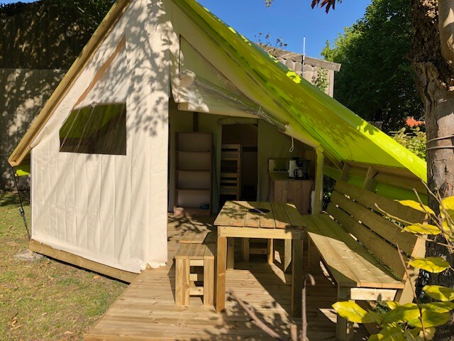 Alojamiento insólito, de forma redonda cubierta con una lona. Sus paredes son rígidas y están aisladas, su puerta de entrada se cierra con llave. No ofrece baño pero le da acceso al bloque sanitario del camping y dispone de una cocina americana equipada. Por lo tanto, le ofrece la comodidad de un alquiler aislado sin renunciar al placer de las vacaciones al aire libre. Tiene una terraza de madera con muebles de jardín para disfrutar plenamente de los paisajes de la marisma de Vandea.