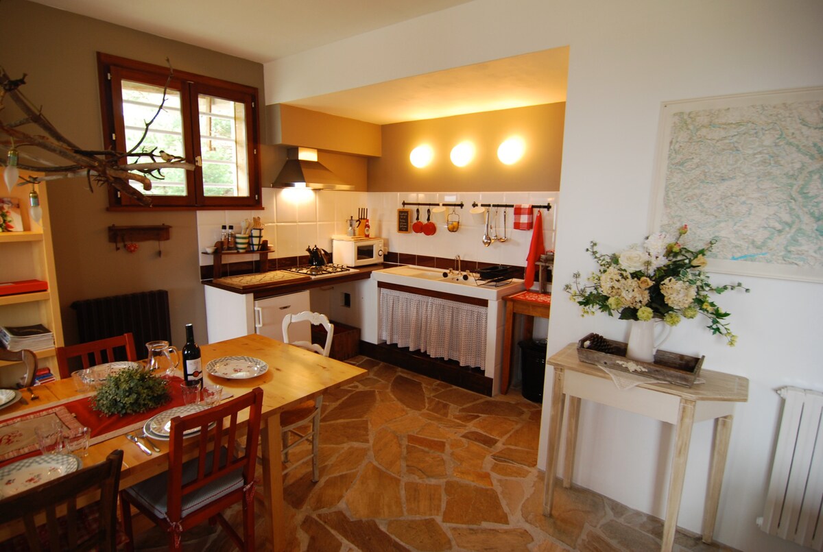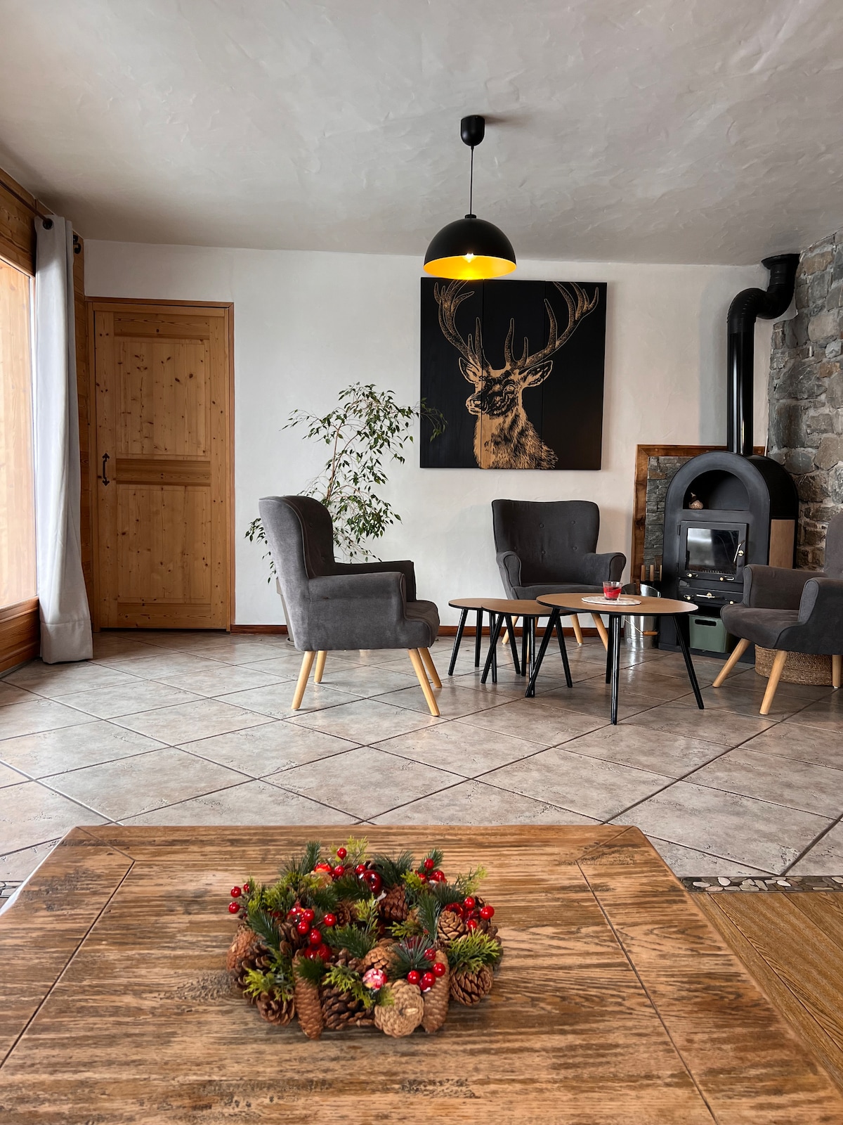 Independent private guest space with a wood-burning fireplace in a mountain boutique guesthouse. The space offers privacy and comfort, with a private equipped kitchen. It can be booked on its own or combined with additional private rooms when travelling with more people, with the price adjusting accordingly. Guests have access to shared outdoor spaces, including gardens, patio, BBQ area, and a warm outdoor bathtub.