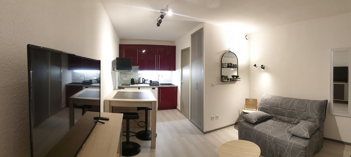 Gracias por leer el anuncio antes de reservar. Estudio agradable y amueblado de más de 30 m2 renovado con estacionamiento privado, en el primer piso sin ascensor. balcón sur Ideal para estancias de negocios o estudiantes cerca de facultades, transporte (tren, tranvía, autobús) y servicios Proporciono ropa de cama y productos de limpieza, el almacenamiento y la limpieza diaria son su responsabilidad (aspiradora, limpieza de superficies, inodoros limpios, cama deshecha, vajilla hecha y guardada...). Cheques de vacaciones