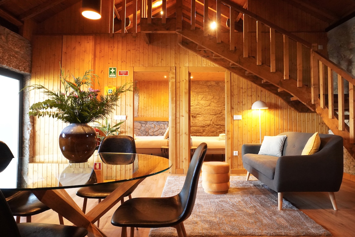 Con ventanas panorámicas que dan al ambiente una sensación de amplitud, permiten la entrada de luz natural y vistas deslumbrantes. Cuenta con una sala de estar, un comedor totalmente equipado, un dormitorio independiente con baño privado y cabina de ducha, un baño en la habitación y un jacuzzi SPA en una plataforma exterior. Las Villas Monte dos Xistos, en la montaña y rodeadas de viñedos y bosques, gozan de una ubicación a 10 km del centro histórico de Guimarães