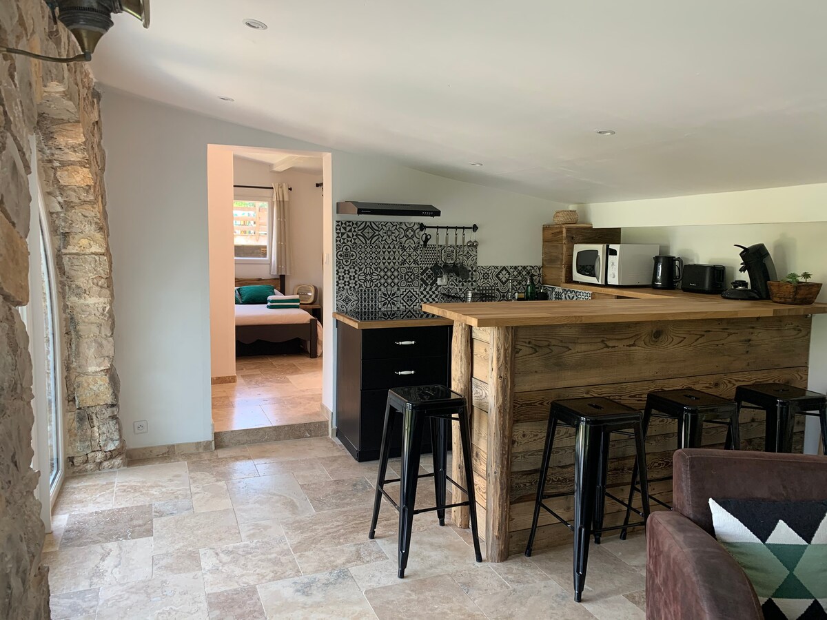 En una antigua bastida situada a medio camino entre el mar Mediterráneo y el lago de Sainte Croix, apartamento independiente de 60 m² situado en la primera planta. Completamente renovado, incluye una sala de estar con sala de estar, cocina, comedor y un dormitorio con un baño. Un sofá cama en el salón permite dar cabida a un total de 4 personas. Se proporcionan sábanas y toallas de baño. La piscina se comparte con el anfitrión.