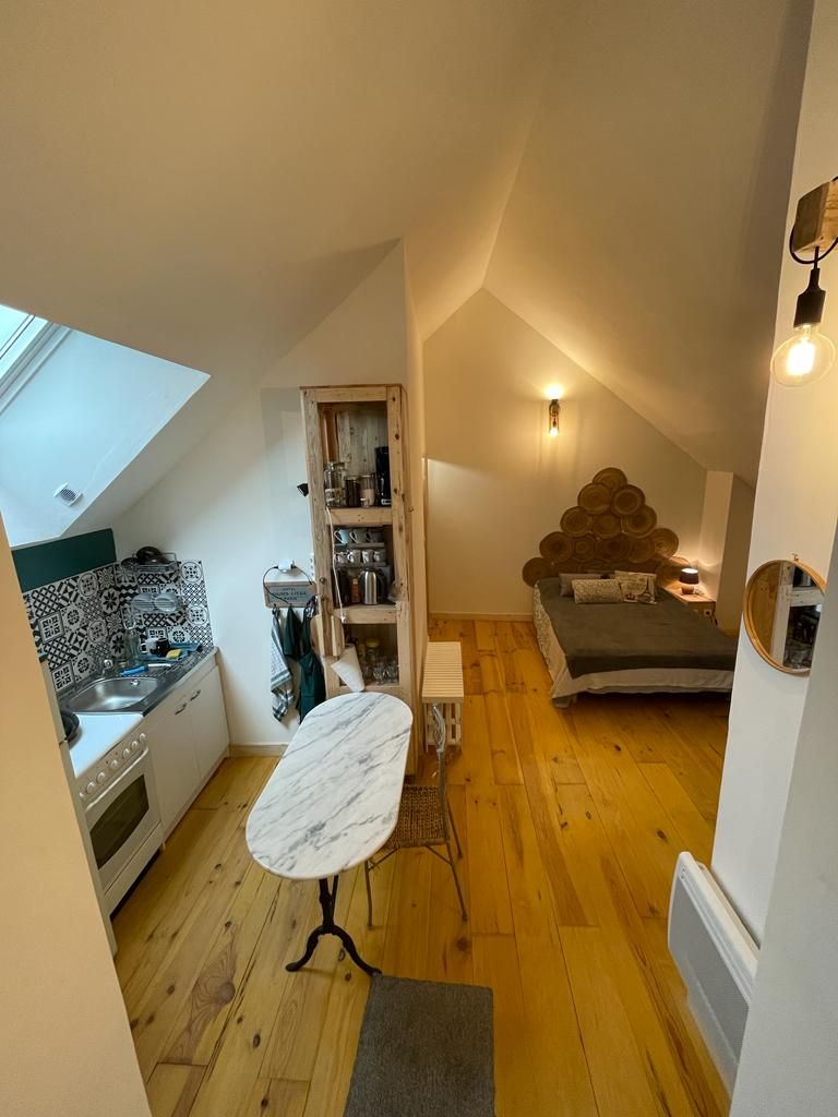 Nous vous proposons un joli studio équipé et calme , une chambre avec 1 lit pour 2 personnes 180cm en mezzanine avec TV , un coin salon avec TV, cuisine, SDB WC, logement pour 2 personnes, rénové entièrement !