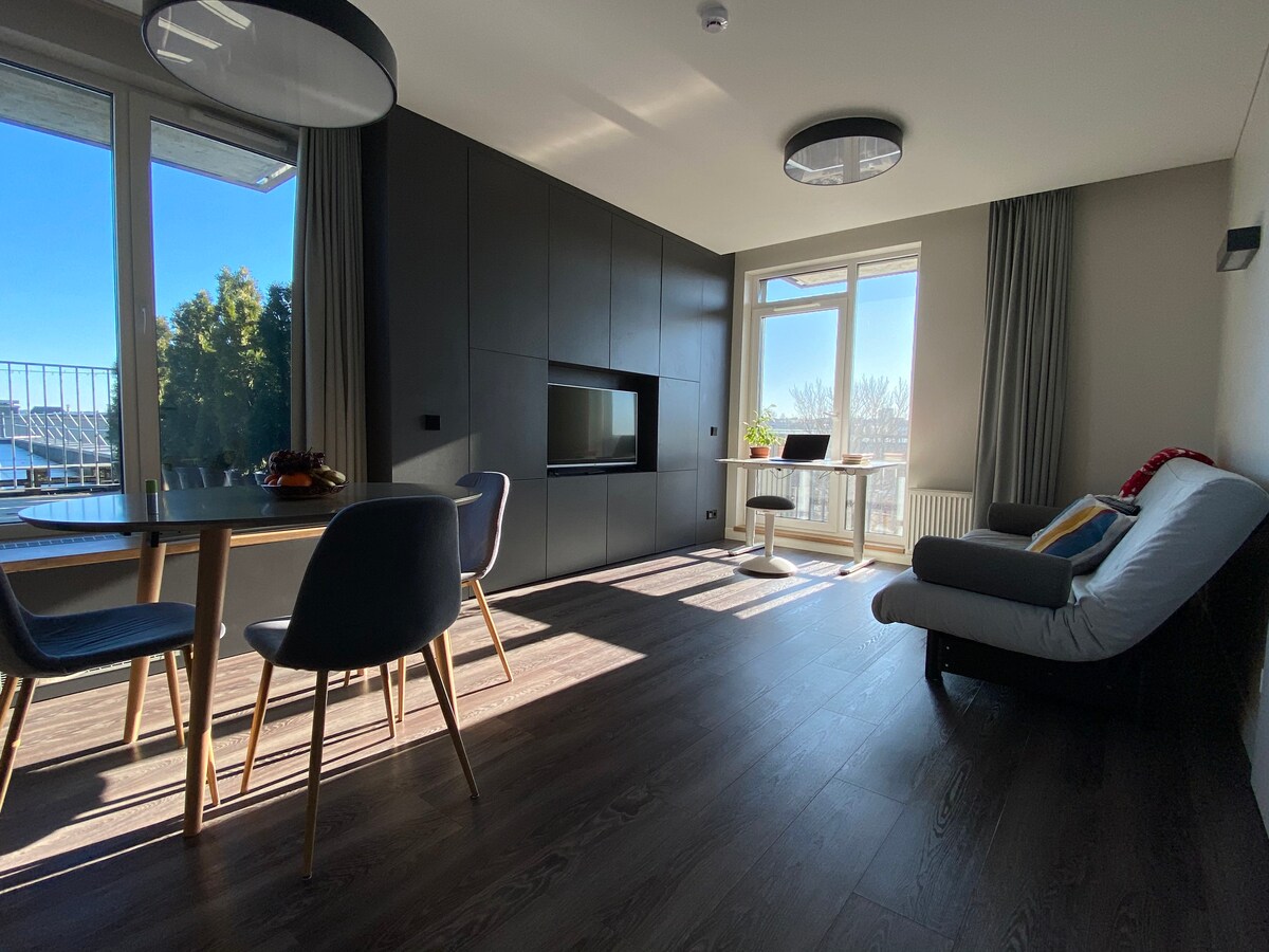 El barrio de Paupys es un nuevo barrio de moda en el casco antiguo de Vilna. Aquí puedes encontrar una amplia variedad de cafeterías, tiendas, patio de comidas Paupys, un cine y casas residenciales de arquitectura moderna. Este acogedor apartamento de 24 metros cuadrados ofrece una sala de estar, todas las características necesarias, un cómodo sofá que se transforma en una cama, cocina equipada, un dormitorio y un balcón. Solo estacionamiento de pago en la calle: I-VI 8-22, 1h - 2,5 Eur.