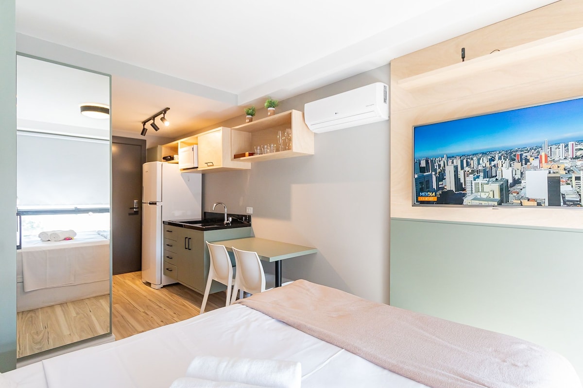 Estudio recién renovado y decorado en el Centro Cívico con: aire acondicionado en todo el medio ambiente, cocina completa, smart tv y barbacoa privada El edificio ofrece pileta climatizada, gimnasio, terraza panorámica, sauna, ludoteca, jacuzzi y lavadero (pagado) Ideal para un máximo de 2 personas, ofrecemos Ropa de cama de toalla de primera fila Excelente ubicación, cerca de centros comerciales, mercados, restaurantes y panaderías con fácil acceso mientras explorás la ciudad Hay estacionamiento de pago en el lugar