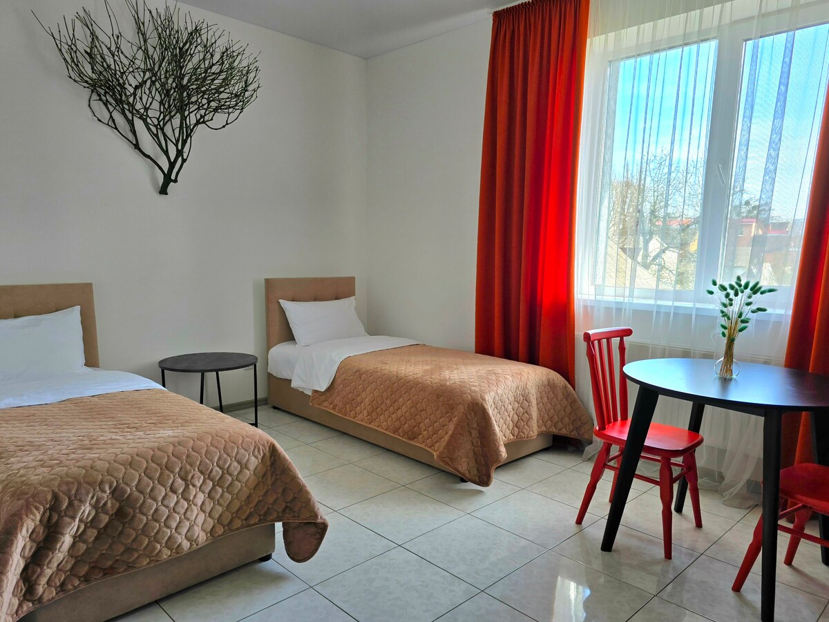 Elegantes y modernos apartamentos de estilo hotel de cuatro camas en un edificio nuevo. El apartamento está recién reformado. Los muebles y electrodomésticos son nuevos y modernos. La habitación cuenta con una cómoda cama doble y un sofá con colchón ortopédico, almohadas y manta, ropa de cama blanca. El apartamento cuenta con cocineta con todos los utensilios necesarios. Los siguientes electrodomésticos están disponibles: estufa eléctrica, refrigerador, hervidor de agua, TV de pantalla plana y TV inteligente. El baño cuenta con toallas, artículos de aseo y secador de pelo. Hay internet WiFi de alta velocidad.