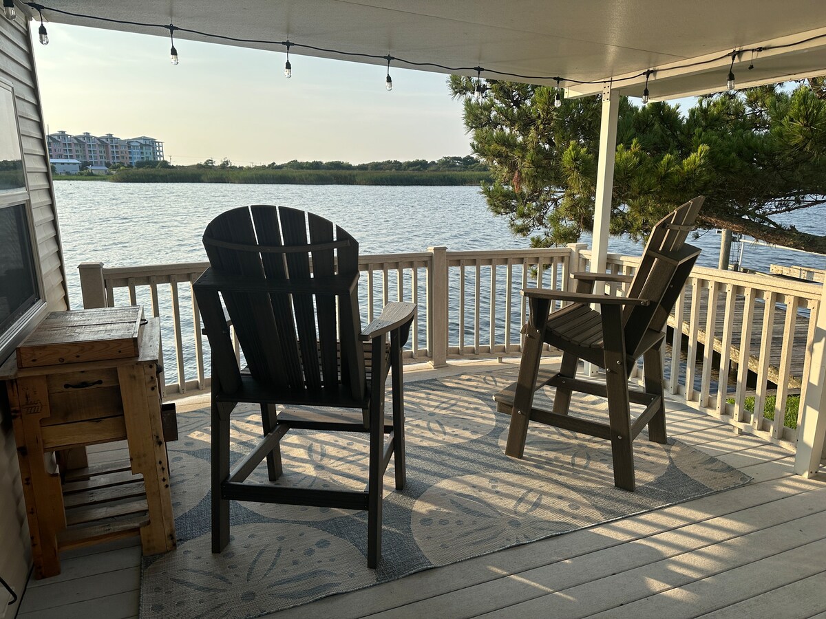 **Newly RENOVATED for 2025**. Trident Cottage is a 2 bedroom 1 bath mobile home situated on a waterfront lot on Back Bay….the beach is a quick 5 minute walk across the street. We include at no extra charge, everything needed for a vacation at the beach! All linens, Beach towels, beach cart, chairs, tent and cooler. Just bring your swim suit and flip flops! I provide you with 2 beach cruiser bikes at no extra charge. Resort amenities are available for your use.