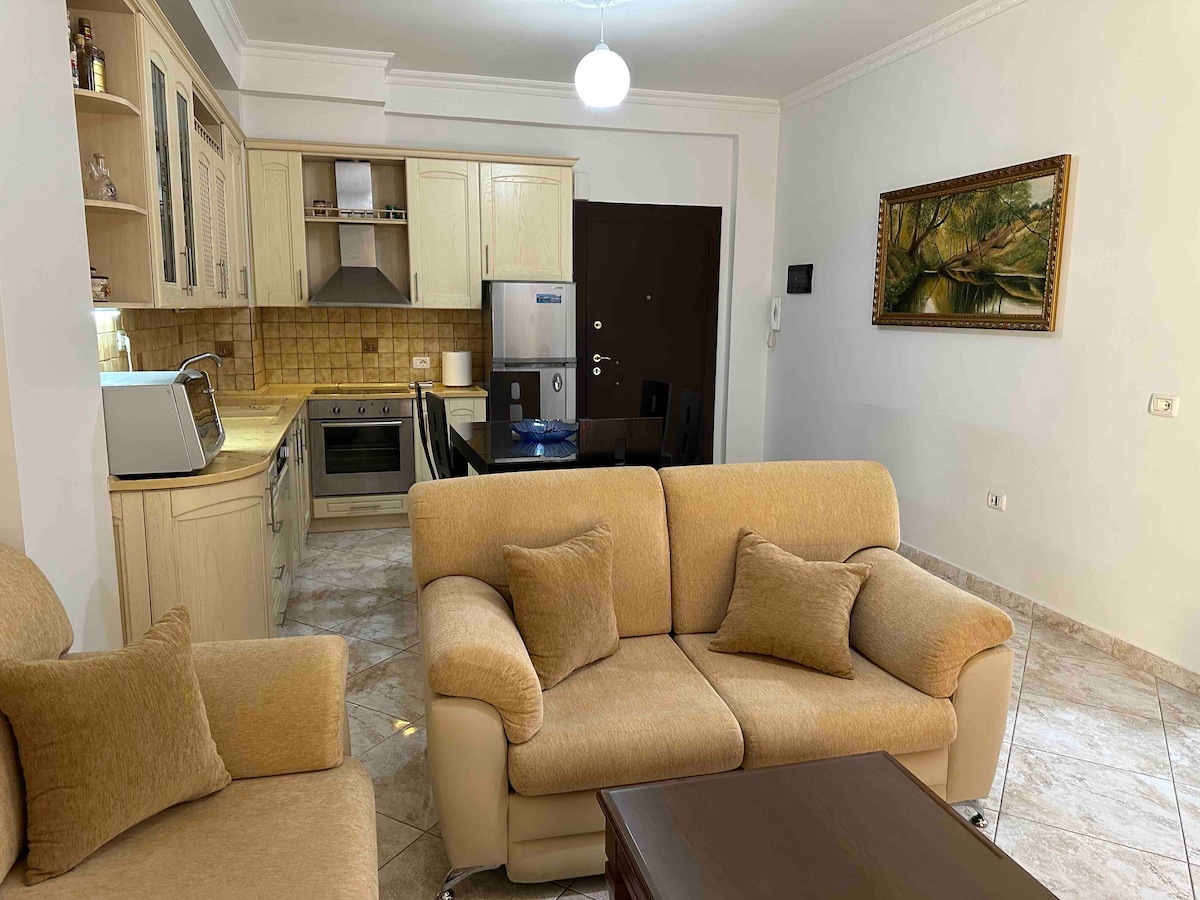 ¡Bienvenido a nuestro elegante y cómodo apartamento de un dormitorio, perfecto para parejas, viajeros solitarios o grupos pequeños! Situado en el centro de Kamëz, nuestro apartamento ofrece fácil acceso a todo lo que necesitas. A solo 10 minutos del Aeropuerto Internacional de Albania y a 15 minutos del centro de la ciudad de Tirana, es una base ideal tanto para viajeros de negocios como de placer. En el interior, encontrarás una cocina totalmente equipada, una acogedora sala de estar con un sofá cama y una decoración moderna y acogedora que te hace sentir como en casa .