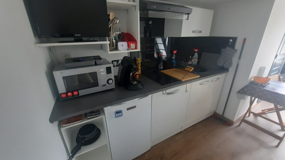 Estudio reformado en Neuf con Terraza. Capacidad 1 Persona Ubicación al borde de una pequeña calle poco transitada Superficie Salón Cocina 12m² y Altura 1.80m / Mezzanine Dormitorio 8m² y Altura 1.55m. Arriba, hay una casa de 60 m² y el salón se encuentra debajo del altillo, corre el riesgo de escuchar algunos ruidos de pasos. Atención el acceso Escalera Mansardé Si es difícil, posibilidad de utilizar el Sofá cama del Salón. Baño pequeño con ducha e inodoro Estudio con aire acondicionado. WiFi Incluido.