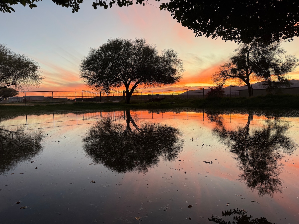 Welcome to Rancho Romance Casita — your private romantic retreat nestled on a lush 1.25-acre ranch just outside Waddell, Arizona. Surrounded by 20 graceful pecan trees, wandering chickens, and horses grazing nearby, this cozy casita offers a peaceful escape into nature — with all the touches of elegance and romance. For guests who want more than just a stay, we offer romantic experience packages designed to elevate your occasion — birthday, anniversary, proposal, or “just because.”