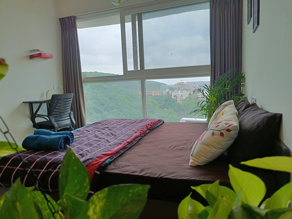Un apartamento estudio tranquilo y acogedor en el piso 15 A 🌿 3,5 km de Balewadi High Street | A 🚗 700 metros de la autopista Mumbai-Bangalore Despiértate con los relajantes sonidos de la naturaleza: el llamado de los pavos reales, el susurro de las hojas y las impresionantes vistas de Baner Hills, el lago Pashan y las luces de la ciudad, todo desde la comodidad de tu cama.