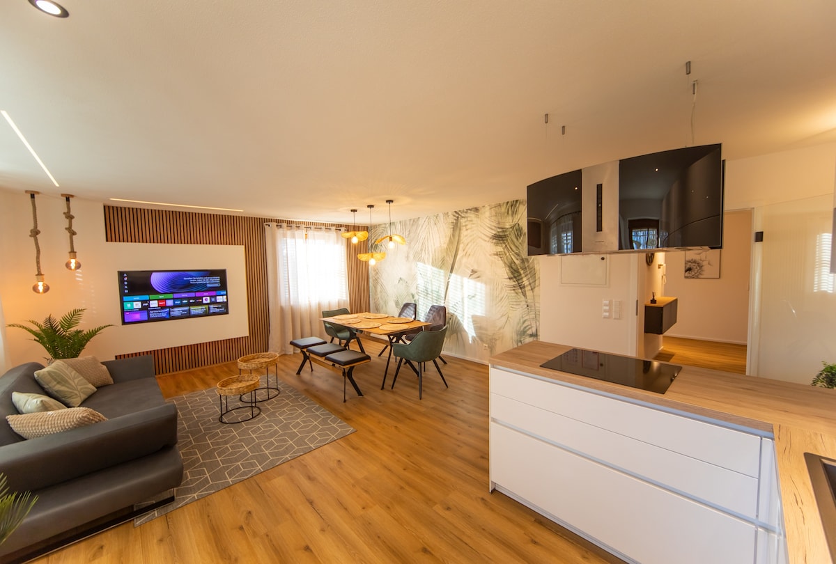 Bienvenido a nuestro encantador apartamento de 50 m² en Grünkraut. Esto tiene un internet de alta velocidad, secador de pelo, caja fuerte, cafetera Nespresso, una cama de somier, una cocina totalmente equipada, un televisor inteligente de 50 y 55 pulgadas, piso de madera real con calefacción por suelo radiante, ropa de cama y toallas, así como un estacionamiento gratuito justo afuera de la puerta. El departamento se encuentra a pocos minutos de Ravensburg. Se puede llegar al lago Constanza en unos 25 minutos en coche.