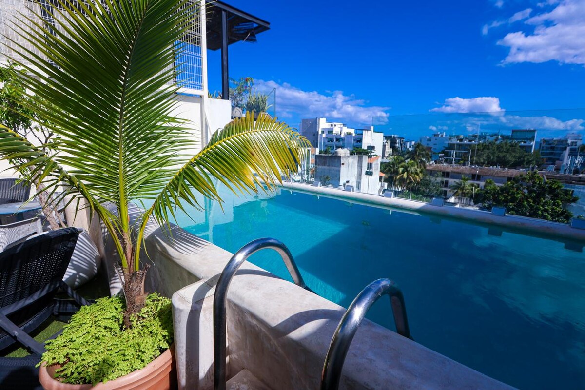 - Azotea con vista al mar con piscina, gimnasio, tumbonas, comedor a la sombra, zona para preparar bebidas/aperitivos. - Cocina pequeña con todos los elementos básicos, electrodomésticos nuevos, una cafetera, asientos en y al aire libre. - Buena conexión WiFi para transmitir y trabajar de forma remota, zona de trabajo apta para computadoras portátiles, TV, aire acondicionado - A ½ cuadra de la famosa 5ª Avenida, bares, vida nocturna y la playa - ¡No esperes más para reservar tu estadía en Playa del Carmen en el corazón de la acción!