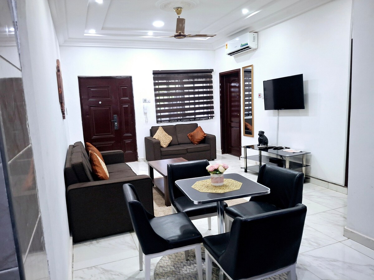 Welcome to your stylish home in Gbawe, Accra. This modern 2bed condo is perfect for guests seeking comfort, privacy, and convenience, just 20 minutes from Kotoka International Airport and close to Accra’s luxury beaches. Unwind in a peaceful, secure neighborhood featuring Fast WiFi, Netflix, a fully equipped kitchen, and spacious, tastefully furnished interiors. Ideal for couples, honeymooners, families, business travelers, and digital nomads, this home is designed for both short and long stays.