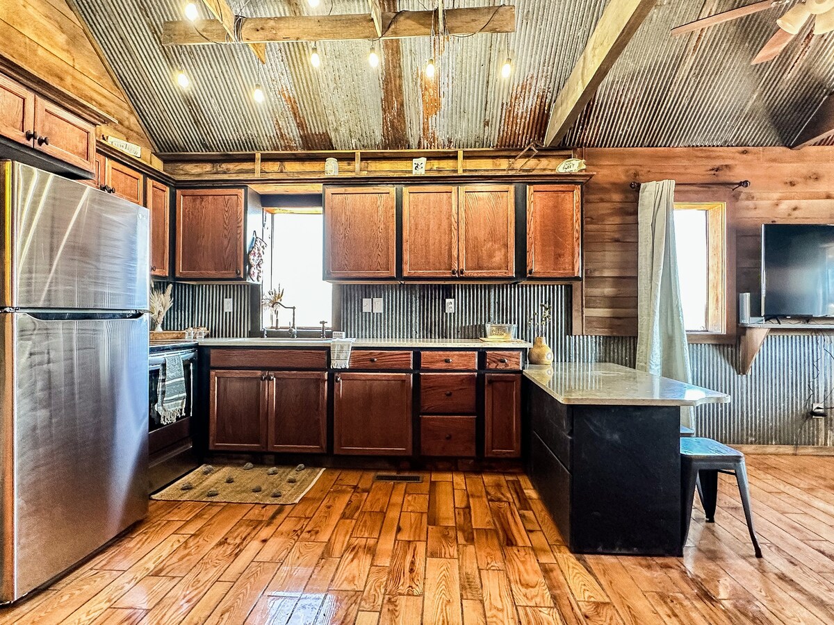 Esta casa fue construida con maderas recuperadas de la zona local. La casa tiene un techo alto abierto y una escalera de madera al balcón, suelos de roble personalizados (también hechos de madera recuperada). La cama principal se completa con un baño principal con una gran ducha de roca que se hizo con piedras de arroyos locales. Arriba tiene una cama tamaño king, cine de 120 pulgadas, asientos adicionales. El porche trasero de cuerpo entero conduce al jacuzzi. Realmente es único.