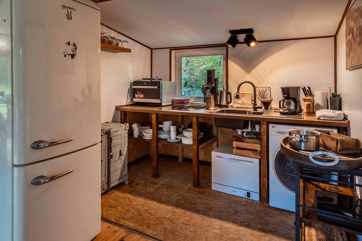 Idylle, Ruhe & Entspannung – all das bietet Euch unser nachhaltiger & baubiologischer Schäferwagen. Wohnwagenmuff ade, denn hier duftet es angenehm nach Holz. Natürliche Materialien schaffen eine besonders angenehme Atmosphäre, in der Ihr Euch wie zu Hause fühlt – vielleicht sogar noch etwas besser. Urgemütliche Stockbetten, eine kleine Pantry-Küche sowie einen Tisch mit heimeliger Sitzgelegenheit für bis zu 4 Personen, runden das Ganze ab. Bad, Dusche & Toilette sind im Haupthaus zugänglich.