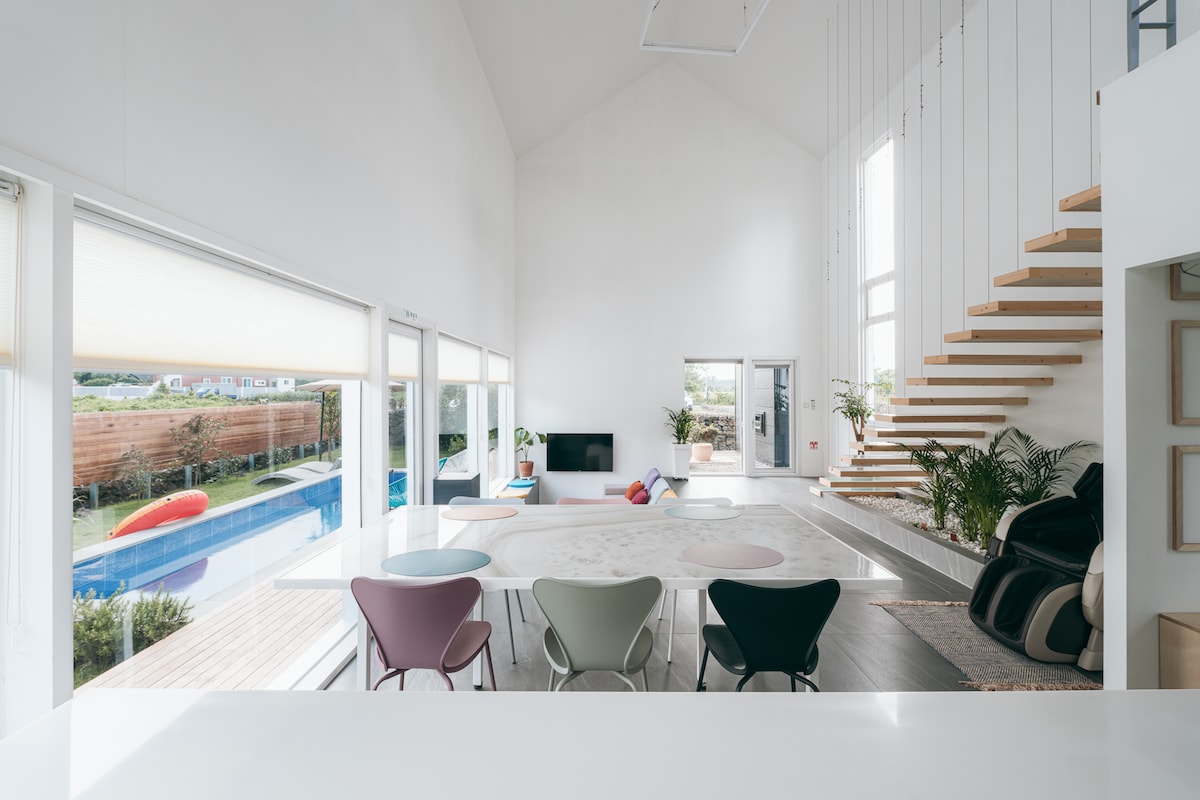 Es una casa rural de dos pisos ubicada en Haengwon-ri, un tranquilo pueblo de molinos de viento. Es una casa hecha con amor, estudié arquitectura para usarla como segunda casa, elegí los materiales uno a uno y la construí yo mismo. Es una casa privada de 1 a 2 pisos. Puede tomar un descanso cómodo y acogedor con el juego de ropa de cama de hotel de la más alta calidad. Hay 2 baños, 2 salas de estar, cocina, lavadero... Puede sentirse como en casa. Tanto el dormitorio como la sala de estar están equipados con aire acondicionado, por lo que se puede utilizar sin ninguna molestia. Si camina unos 10 minutos, puede encontrar la hermosa playa de Woljeong-ri, que es popular hoy en día, y también hay una playa tranquila con una playa bonita (también conocida como Konan Beach) donde puede recoger conchas y divertirse en el agua. Es genial para viajar a lugares turísticos en el este de Jeju. Bañera para niños, silla para niños, asiento para niños Están preparados:) También hay tubos, tiendas de campaña y tapetes para jugar en el agua en la playa en verano. De julio a agosto, la piscina simple está abierta.