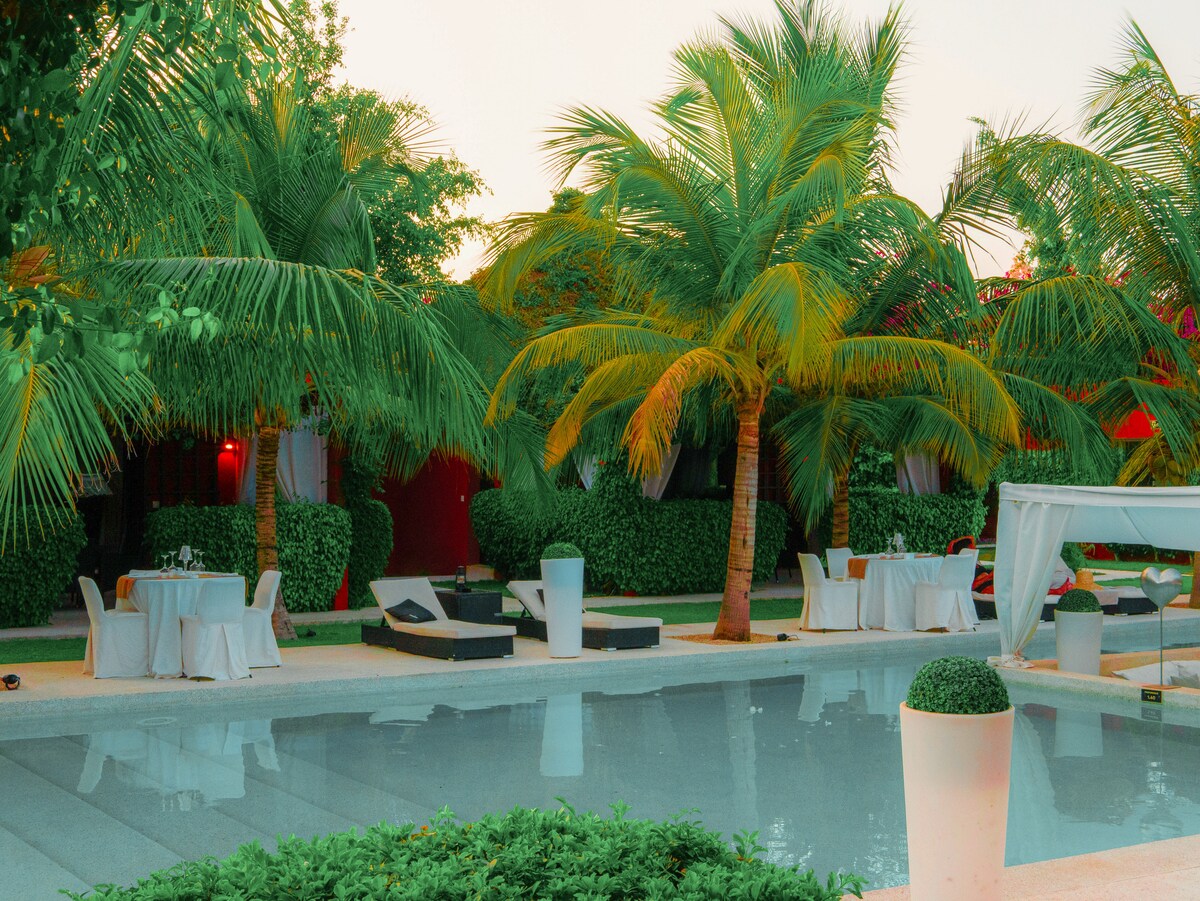 Chambres et suites modernes en avec salle de bain privé, clim, Tv, Patio privé . 1 Suite avec piscine privée . 1 Suite Africaine avec baignoire , 2 Chambre Superior. Une grande piscine, Salle de Massage Navette aéroport Résidence calme et securisée, à 5 min du centre ville . Restaurant "The Black Diamond" à la carte à l'intérieur de l'Hotel LES TARIFS SONT POUR UNE CHAMBRE DOUBLE STANDARD PETIT DEJEUNER INCLUS . Merci de nous contacter pour les autres Chambres ou Suites