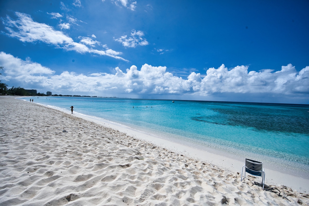 Apartamento de 1 dormitorio recién reformado a solo 50 pies de Seven Mile Beach en West Bay. Desde el balcón tienes una vista parcial de la playa. Este apartamento tiene todo lo necesario para una estancia cómoda y el colchón de espuma viscoelástica te garantizará un gran descanso nocturno. El restaurante Alfresco está al otro lado de la calle y la bahía de Camana está a 8 minutos en coche. También hay un cómodo sofá cama en el salón con un colchón tamaño queen de espuma viscoelástica para huéspedes adicionales. También hay una lavandería compartida en el lugar.