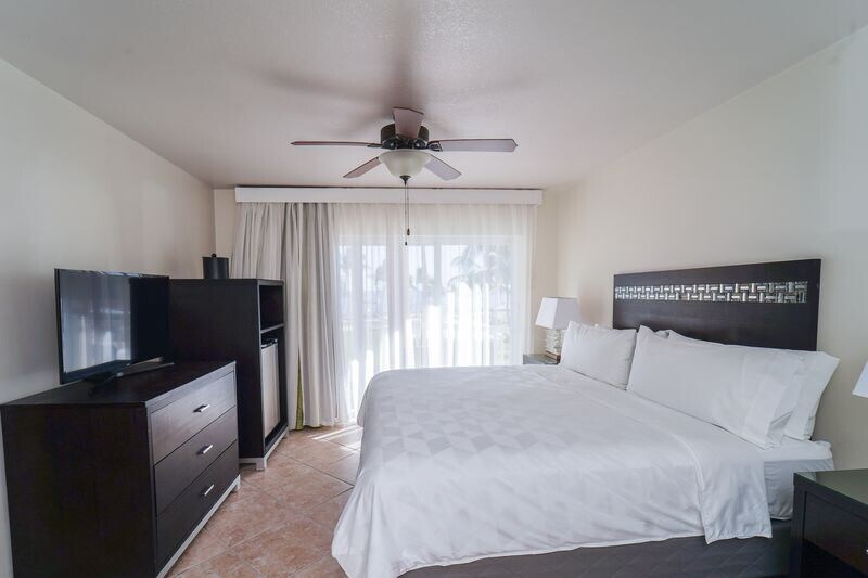Vista a la isla: suite tamaño king de un dormitorio Amplia suite de 900 pies cuadrados con un dormitorio privado con cama tamaño king y baño privado con tocador doble con ducha a ras de suelo. Incluye una cocina completa, comedor y sala de estar con sofá cama tamaño queen. Disfruta de un balcón o patio privado, TV de pantalla plana en el dormitorio y la sala de estar, caja fuerte en la habitación, cafetera, microondas, nevera de tamaño completo, horno, estufa, plancha, secador de pelo y mucho más. Capacidad para 4 adultos o 3 adultos y 1 niño.