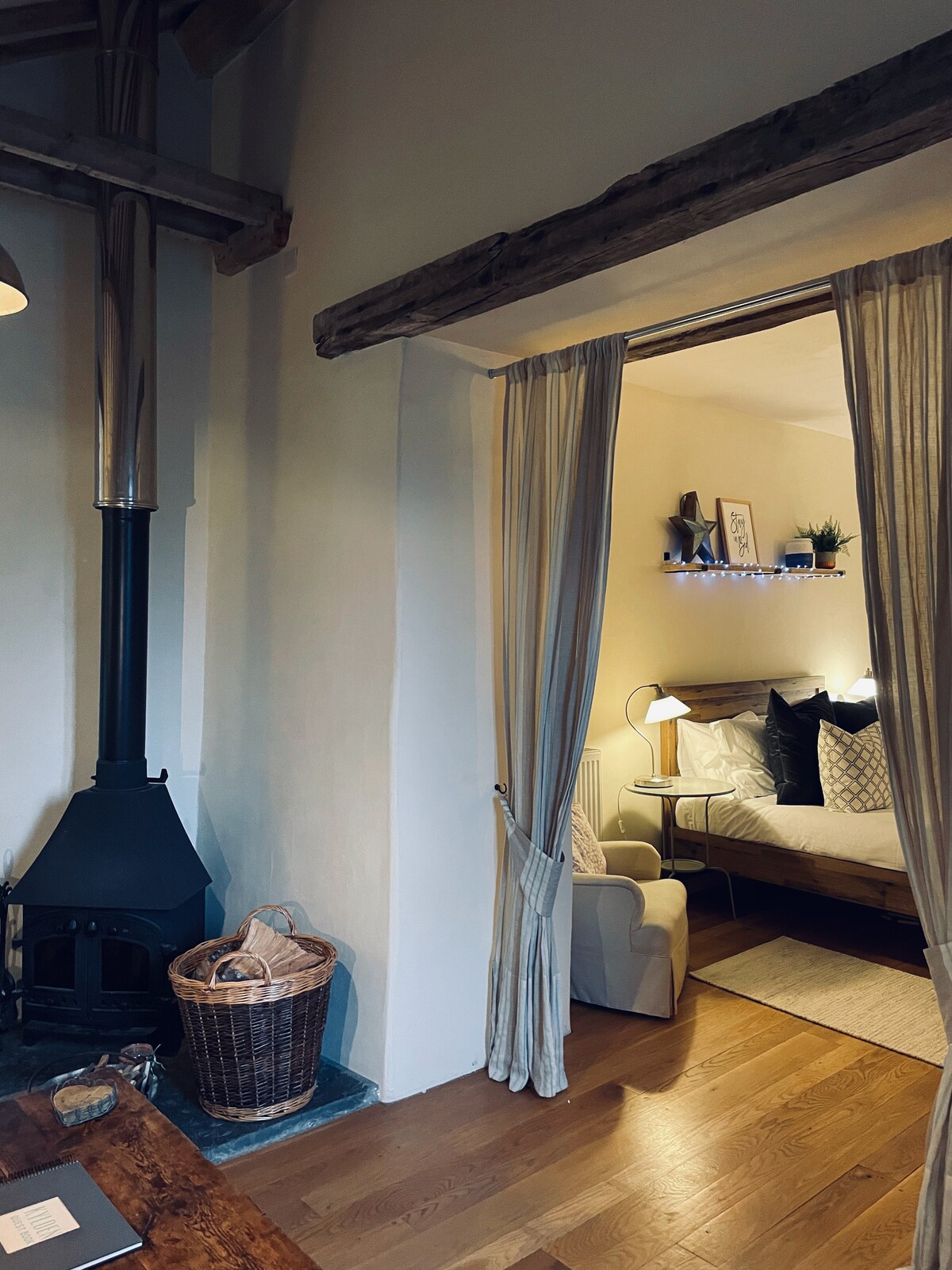 A calm, deeply luxurious space to recharge & reconnect. The Shippon is a meticulously converted cow barn with heated, polished concrete floors, gently curving deep green walls, hand-built kitchen, warmly lit reading nooks, & natural materials. Woollen blankets, feather sofa, antique Scandinavian log burner, king-size bed with French linen & down, waterfall shower, & the softest towels. Our sleepy Devon hamlet is only lit by stars at night. You might just sleep better than you have in years.