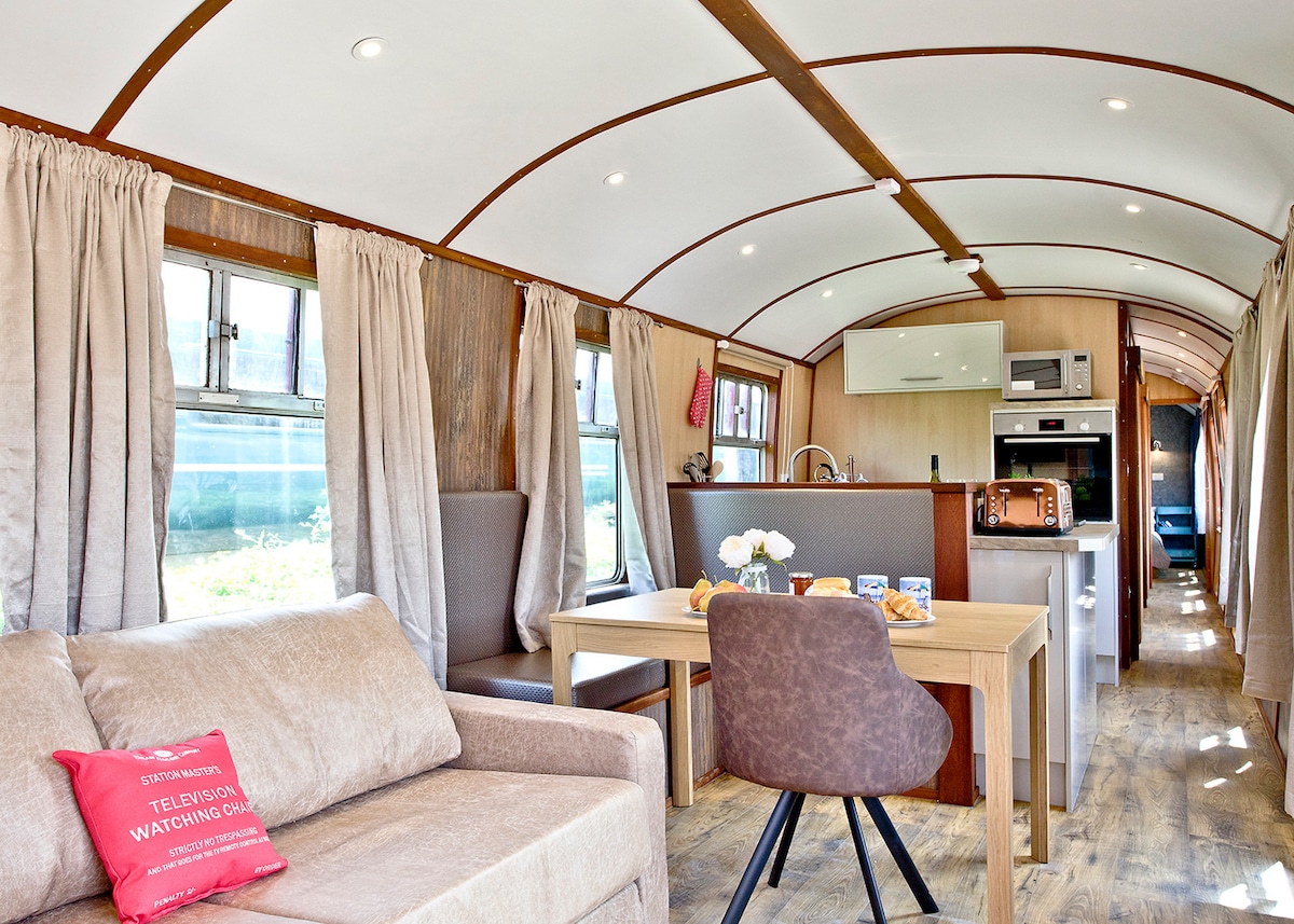 Carromato de lujo, baño con ducha y estufa de leña, ubicado en un huerto. Dirigimos una escuela de equitación con licencia, Red Park Equestrian Centre, y tenemos muchos caballos y ponis amigables. Una unidad totalmente independiente, bien equipada: nevera de tamaño completo, nevera, placa de dos fuegos, televisión inteligente, wifi y una cama acogedora. Hay espacio al aire libre con banco de pícnic y un horno de pizza de leña. Ten en cuenta que puede haber ruido de un parque infantil. Estás a poca distancia a pie del pueblo con maravillosos pubs, restaurantes y comida para llevar.