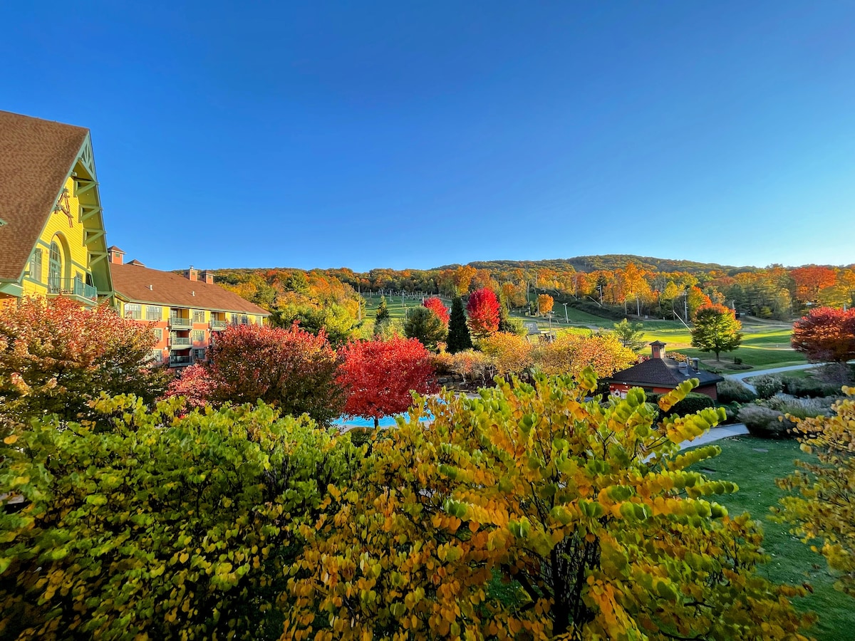 Ski-In-Ski-Out ! Top floor 1 bedroom Condo with Mountain/Pool View at Mountain Creek Resort. Steps away from ski mountain & gondola ! Swim in the outdoor heated saltwater pool, relax in the sauna or soak in the hot tub while taking in mountain views, Catch the sunset from your private top floor balcony or cozy up by your gas fireplace. Visit award-winning spas, golf, breweries, wineries, farms, and fine dining at Crystal Springs & Warwick, NY--only 10 min away.