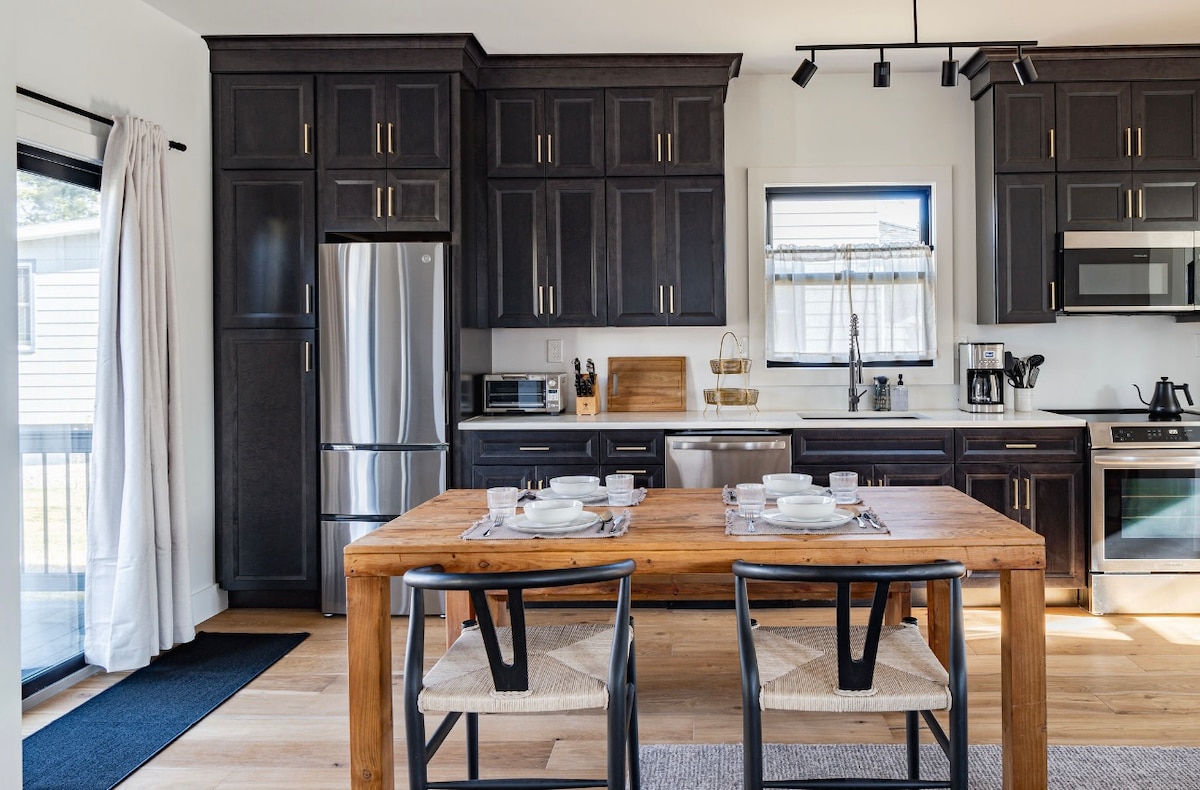 Casa nueva construida a medida única construida a propósito para las misiones de Airbnb. Esta casa ofrece un diseño distintivo con un gran dormitorio loft y un baño totalmente revestido de azulejos. El loft tiene vistas a la sala de estar de la planta baja, que tiene una sala de estar abierta, comedor y cocina. El segundo dormitorio y el baño se encuentran en el primer piso. El granito, la pizarra y la piedra de jabón acentúan las encimeras, los tocadores y los pisos. También verás un montón de pino natural, nogal y cedro local en toda la casa.