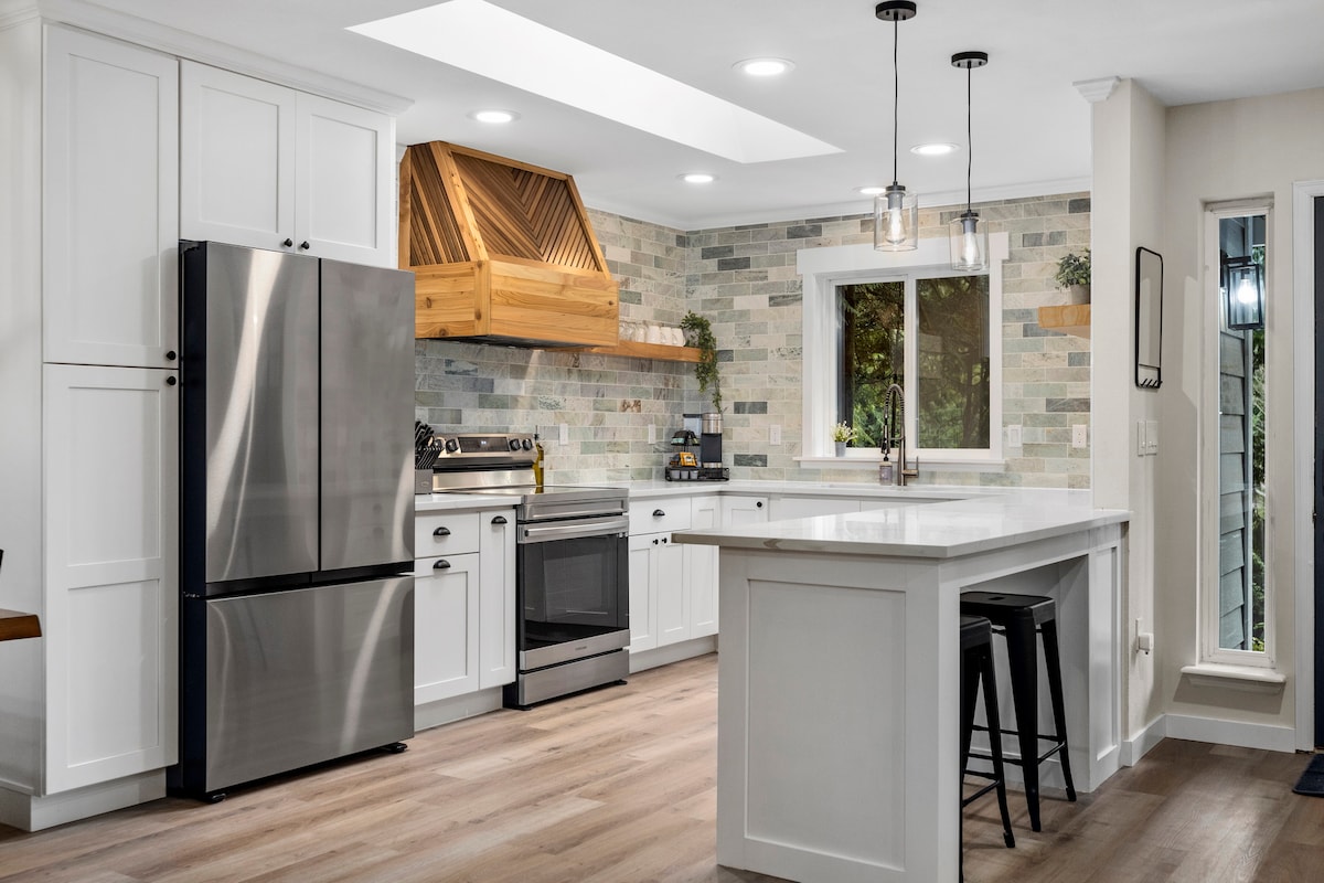Unwind at this stylish and serene woodland retreat—your perfect basecamp for adventure or relaxation. Nestled in a peaceful forest setting, it's just steps from a scenic nature preserve trail and close to miles of hiking and mountain biking. After a day of exploring, kick back in comfort and take in the quiet surroundings. In winter, hit the slopes at Mt. Baker or cross the border for a ski day at Cypress Mountain. A cozy, modern escape with year-round access to the best of the outdoors.