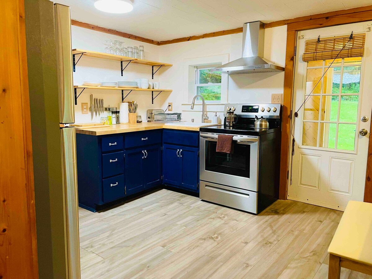 Disfruta del encanto vintage de Jameson Cottage, una casa de campo de mediados de siglo rodeada de naturaleza. • Servicios modernos y acabados rústicos de madera. • Parrilla de gas y chimenea. • Dos dormitorios queen, sala de estar abierta y baño completo te esperan. • La cocina compacta cuenta con hermosos armarios y estantes abiertos. • Relájate en la sala de estar o explora el patio trasero con su abundante flora. • Disfruta de las comodidades, da rienda suelta a la creatividad culinaria y disfruta del lujo de una bañera con patas.