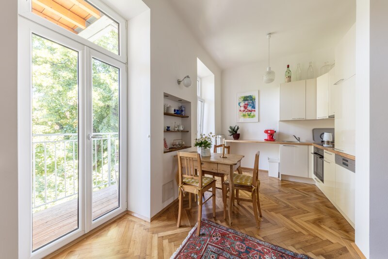 Un acogedor apartamento histórico rediseñado con vistas a los tejados de la histórica Viena. Materiales como el ladrillo, la madera y el acero se han restaurado cuidadosamente, se han dejado a la vista y se han complementado con muebles de madera de diseño moderno en el centro del apartamento.