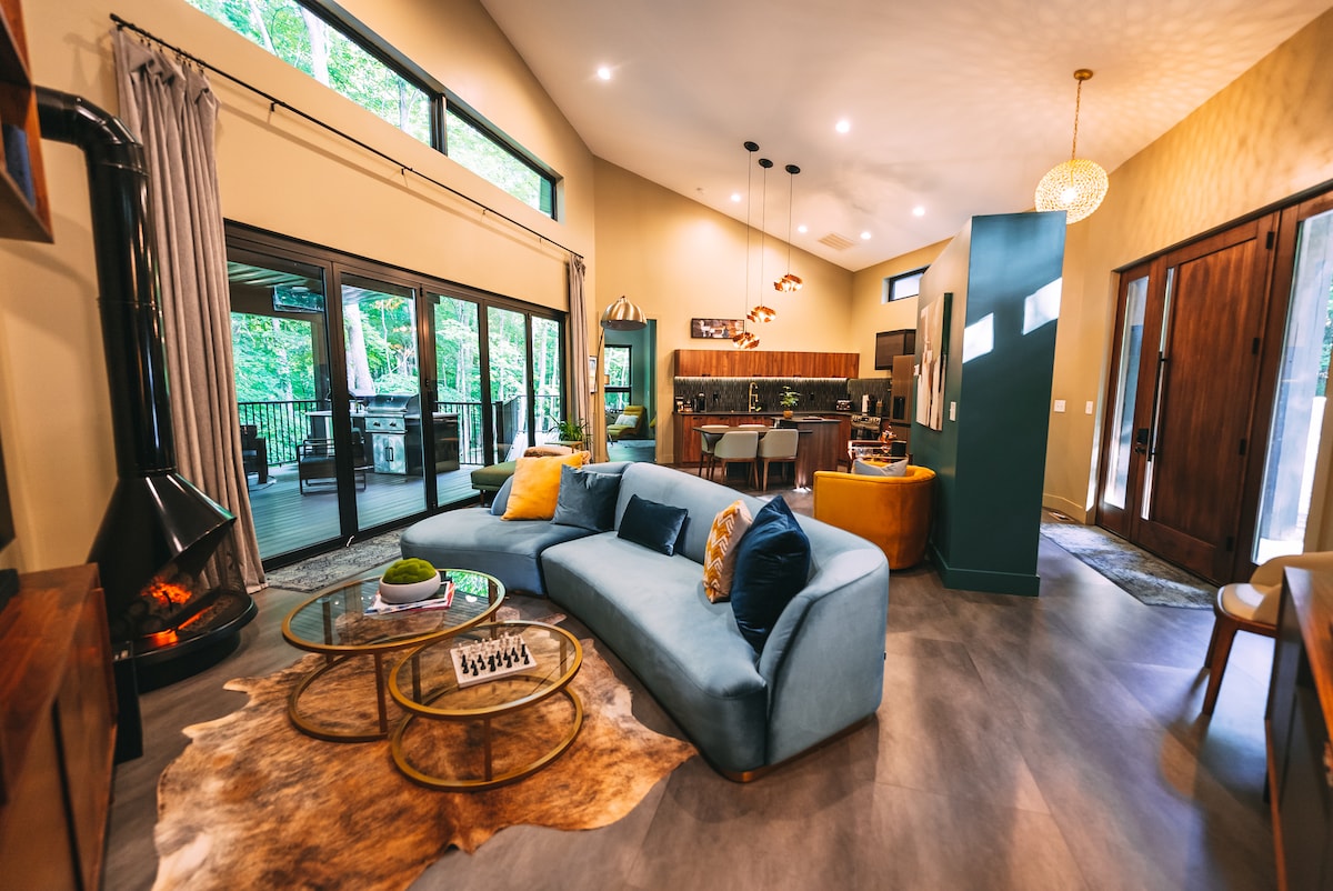 The Nest at Dunlap Ridge is a Luxury Couples Cabin nestled in Hocking Hills. Be prepared to fall in love with the panoramic floor to ceiling windows, the warm, organic modern decor, and the privacy! Whether you decide to spend your time on the deck drinking coffee, soaking in the hot tub or enjoying S'mores by the secluded fire-pit you are sure to be impressed! The Nest has a fully equipped Kitchen, a Modern Bathroom, a King size bed, an Indoor Fireplace, and stunning interior decor.