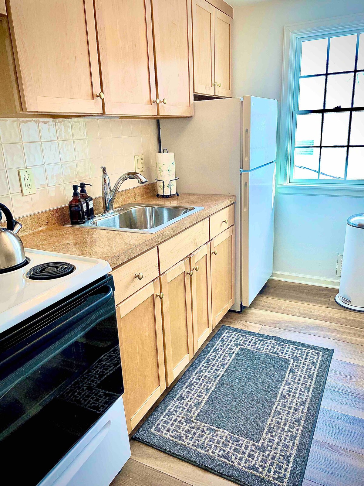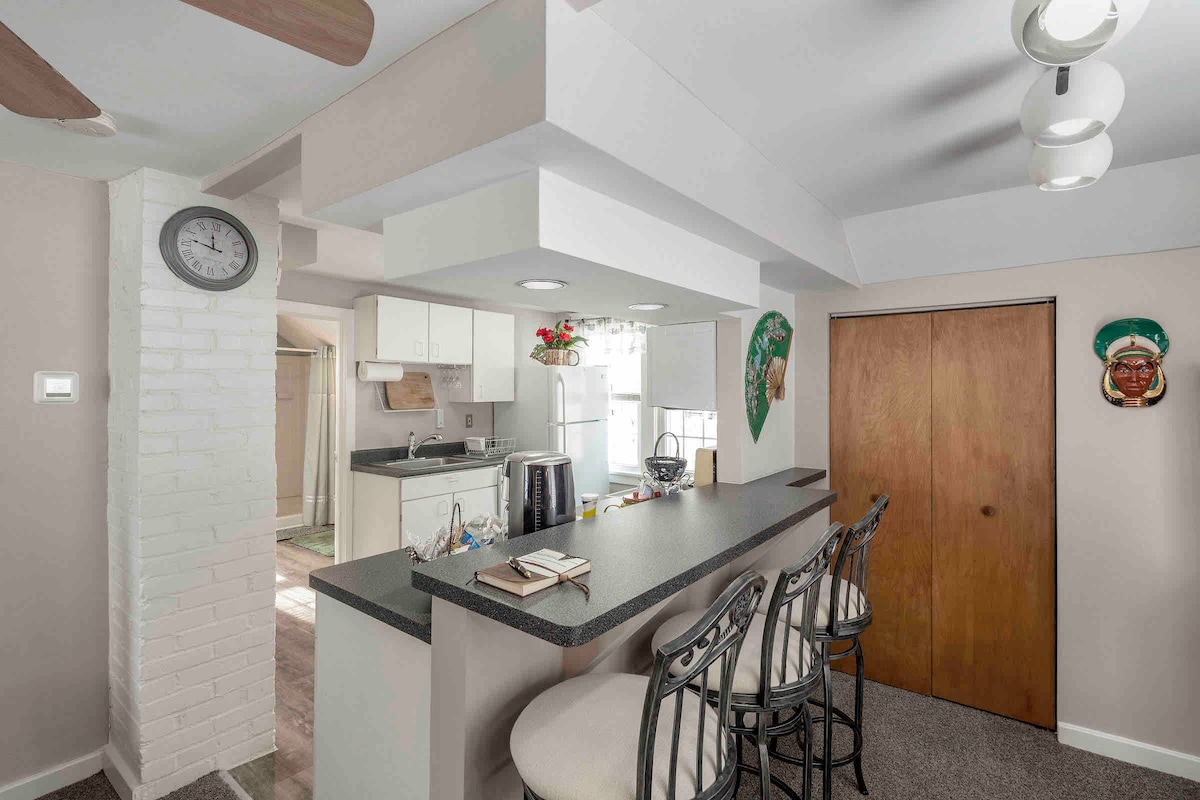 Acogedor apartamento de 1 dormitorio en el segundo piso Comedor en la cocina con asientos a la altura de la mesada 2 camas tamaño queen (cama y sofá desplegable) Lavavajillas y horno microondas nuevos incorporados Todos los utensilios de cocina, vajilla y electrodomésticos Totalmente amueblado con todas las sábanas, toallas y suministros de jabones y shampoos. Amplio espacio en el armario y almacenamiento Filtro de agua para toda la casa Lavandería ubicada en el sótano Estacionamiento fuera de la calle para 2 automóviles