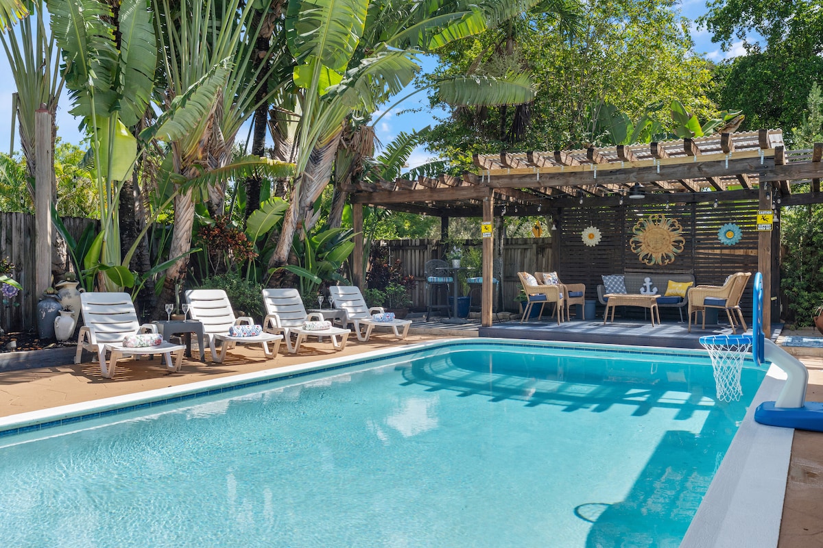 Experience complete relaxation at our island style home. Centrally located in Pompano Beach next to Ft Lauderdale, 2 miles from the beach. Fall in love with sitting on the dock while boats pass by, swinging on the hammock, watching the game outside while grilling, hanging out in egg chairs over the pool or feeling weightless in the hot tub. Kayaks free for your use, house is STOCKED with supplies, hi-speed internet, 50” Roku TV in all bedrooms. Get the BEST Florida experience right here!!