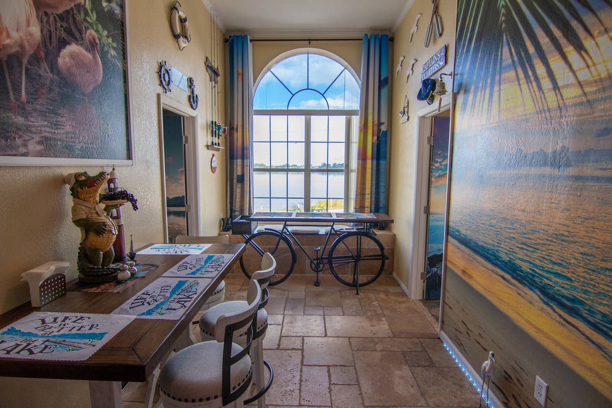 Bring your boat, skis, fishin’ pole, or any other water toys! We supply ping pong, corn hole, bicycles and other toys! Directly across from Lake Howard boat ramp and 10 minutes from LegoLand! Enjoy this spacious, well-equipped 2300 sf home that has everything you need to enjoy your stay in Winter Haven, aka Chain of Lakes City, a quaint downtown with free parking-- and just a skip away from Disney and Universal. This getaway is an above-average accommodation both in style and comfort!