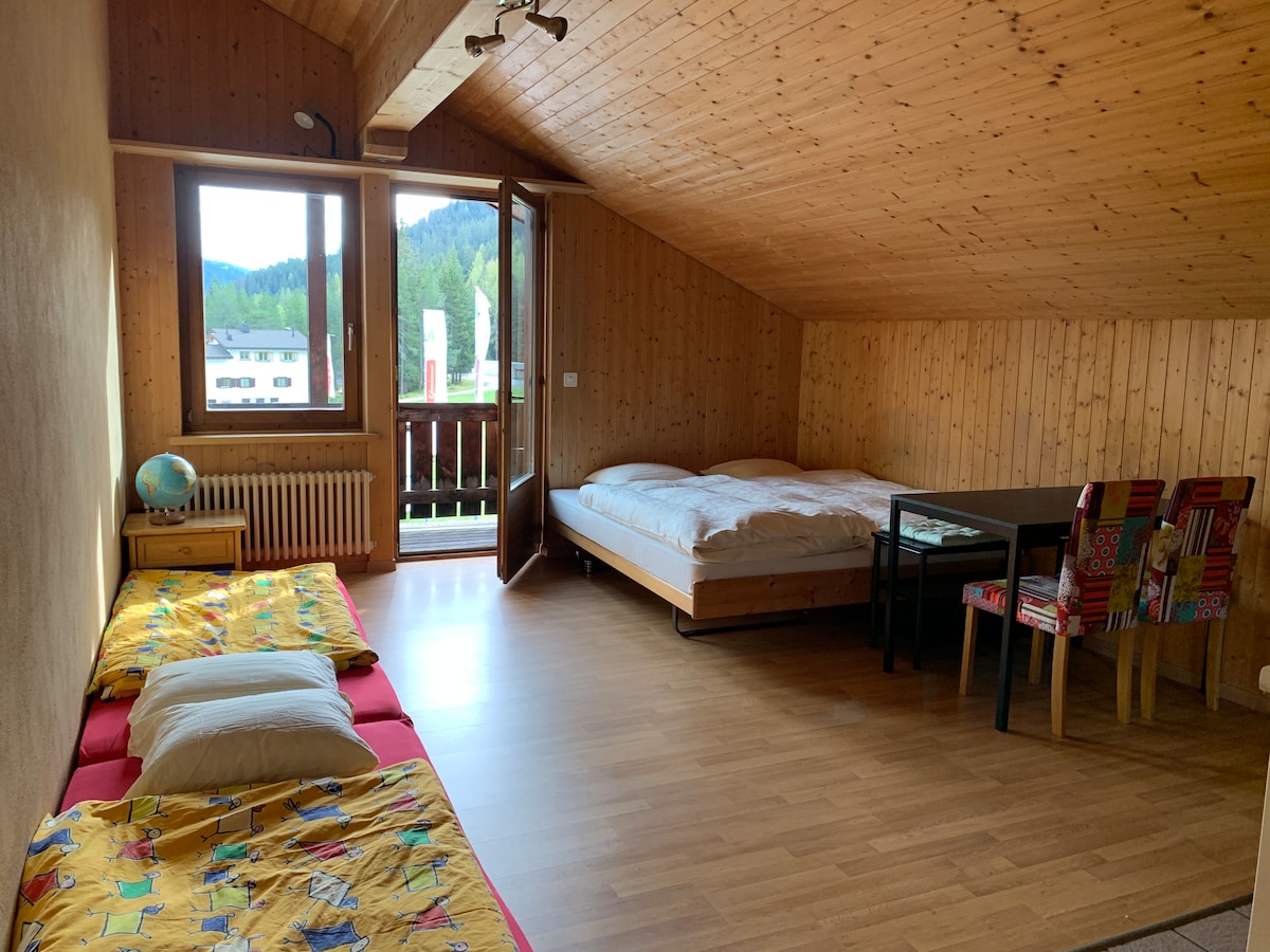 ¡Estudio muy encantador y acogedor con unas vistas fantásticas de las montañas de Klosters! Gracias a su ubicación cercana al centro, se puede llegar al centro de Klosters a pie en aprox. 10 minutos a pie o 2 minutos en autobús local. Klosters ofrece diversas actividades de ocio que se pueden practicar durante los meses de verano e invierno. El campo de golf, el complejo deportivo, la playa, las rutas de senderismo y ciclismo, el telesilla Selfranga, la pista de hielo y la pista de Gotschnabahn están muy cerca. Desde Gotschna, se puede bajar hasta casi la misma puerta de la casa con los esquís puestos.