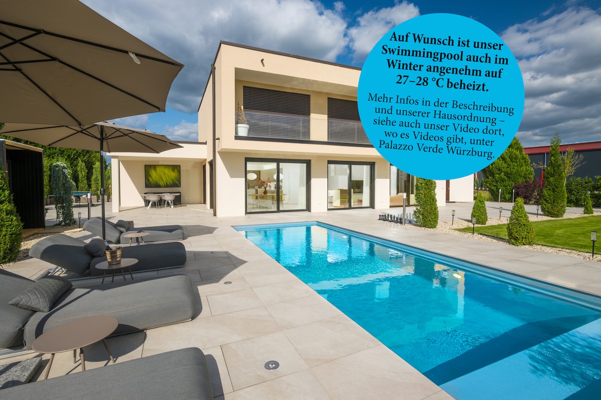 Willkommen in Ihrer exklusiven Oase. Diese atemberaubende Neubauvilla bietet ein unvergleichliches Erlebnis von Luxus, Komfort und Ruhe. 187 qm Fläche, eigener Garten, Swimmingpool (auch im Winter mit – 27–28 °C garantiert optional nutzbar (Details/Preise siehe Hausregeln), Sauna und Whirlpool, 2 Garagen. Das Palazzo Verde eignet sich hervorragend als Location für Foto- und Videoaufnahmen. Außerdem beinhaltet die Villa 2 Schlafzimmer, ein Badezimmer u. eine moderne vollausgestattete Küche.
