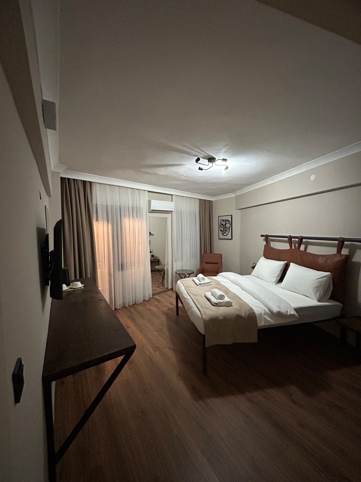 Butik otelimizin ferah, geniş, iki kişilik studio odasında rahat ve konforlu bir şekilde konaklayabilirsiniz. Odamızda çift kişilik yatak bulunuyor. Akıllı Tv ve klimalıdır. WiFi hizmetimiz bulunmaktadır. 7/24 resepsiyon hizmetinizdedir.
