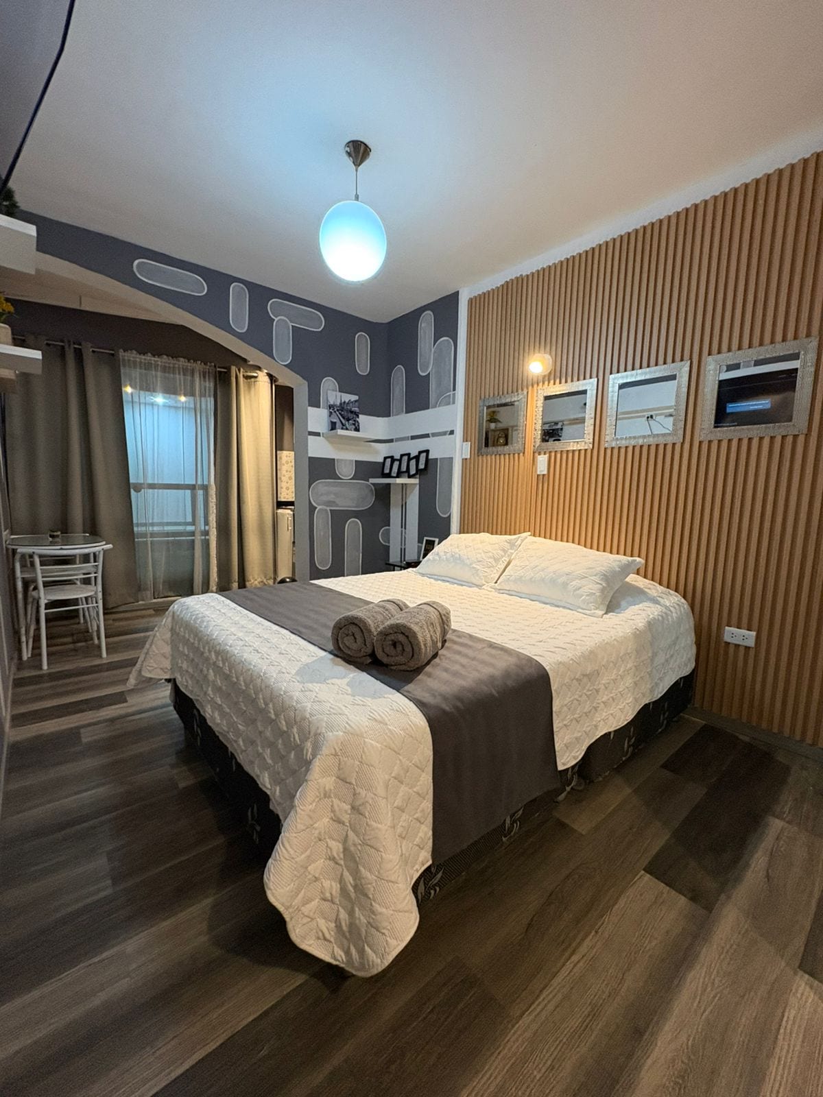 Disfruta de una experiencia con estilo en este alojamiento céntrico. Moderno estudio diseñado para ofrecer comodidad y estilo en un espacio compacto pero completamente funcional. Perfecto para viajeros de negocios, parejas o aquellos que buscan una escapada tranquila. Cuenta con Wi-Fi de alta velocidad, TV streaming (prime Netflix) toallas y ropa de cama incluidas, además de una cocina completamente equipada con todo lo necesario para preparar tus comidas. PH, jabón, champú cortesía.
