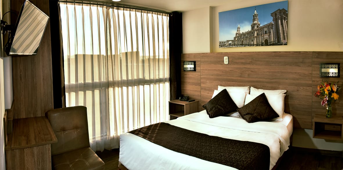 Habitaciones con cama grande y baño privado en hotel, ubicada en avenida principal de Arequipa. Cerca de centros comerciales, restaurantes, bancos, además de la Plaza de Cayma y Yanahuara. Ideal para parejas que buscan privacidad, comodidad y fácil acceso a la ciudad. Como complemento, también ofrecemos habitaciones con cama doble, perfectas para viajes familiares o grupos que deseen compartir estancia en un mismo lugar.