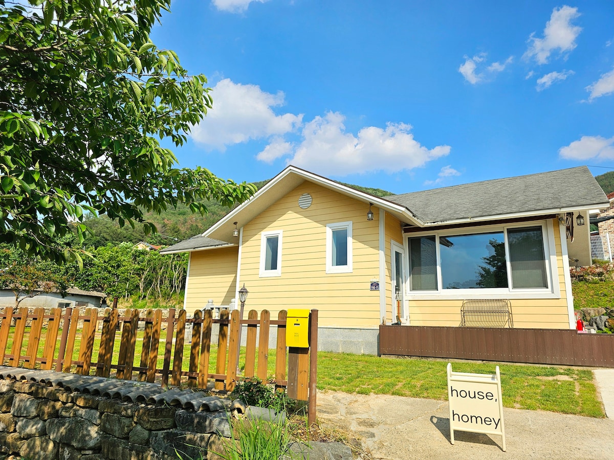 Es una casa de pueblo ubicada en un lugar llamado Dundeok en la costa oeste de la isla Geoje. Es una casa de pueblo que la pareja anfitriona arregló y refinó personalmente para un largo día. Este es un alojamiento emocional que ha hecho la aparición de la antigua casa lo más posible y tiene un interior europeo con materiales ecológicos. El techo bajo y la estructura de la casa antigua única son divertidos y puedes sentir la sensación de una casa de pueblo. Se encuentra en medio del pueblo, donde se encuentra la oficina de Dundeok-myeon, y hay Hanaro Mart, restaurante chino, hamburguesa hecha a mano Hot Place, tienda de conveniencia, restaurante de pollo, Hot Place, Prop Shop, 5 cafeterías Blue Ribbon y otros restaurantes, por lo que puedes utilizar todos estos servicios a pie. Hay un estuario que sale al mar a 3 minutos a pie, Puedes caminar por el paseo marítimo hasta el mar mientras disfrutas del paisaje del hermoso estuario. Es un lugar donde puedes sentir la sensibilidad de un pueblo rural tranquilo y cálido. También es un buen lugar para explorar famosas atracciones turísticas cercanas. La ubicación exacta del anuncio es Son 6, Hadun 3-gil, Dundeok-myeon, Geoje-si, y te lo recordaremos en cuanto esté reservado. Llegada a las 3 p. m. Check-out 12:00 a. m.