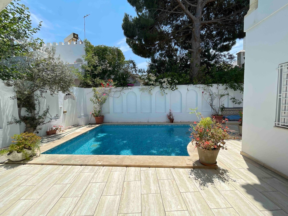Este alojamiento elegante es perfecto para familias. Este situado en Hammamet norte, cuenta con una piscina con jacuzzi y un hammam turco. La playa está a 15 minutos a pie. Un lugar tranquilo y seguro, cerca de tiendas, restaurantes y hoteles. La casa está totalmente climatizada y climatizada Nota: La villa no es para ir de fiesta. Se debe respetar la tranquilidad a partir de las 11:00. El propietario vive justo encima de la villa. La puerta exterior es común con el propietario.