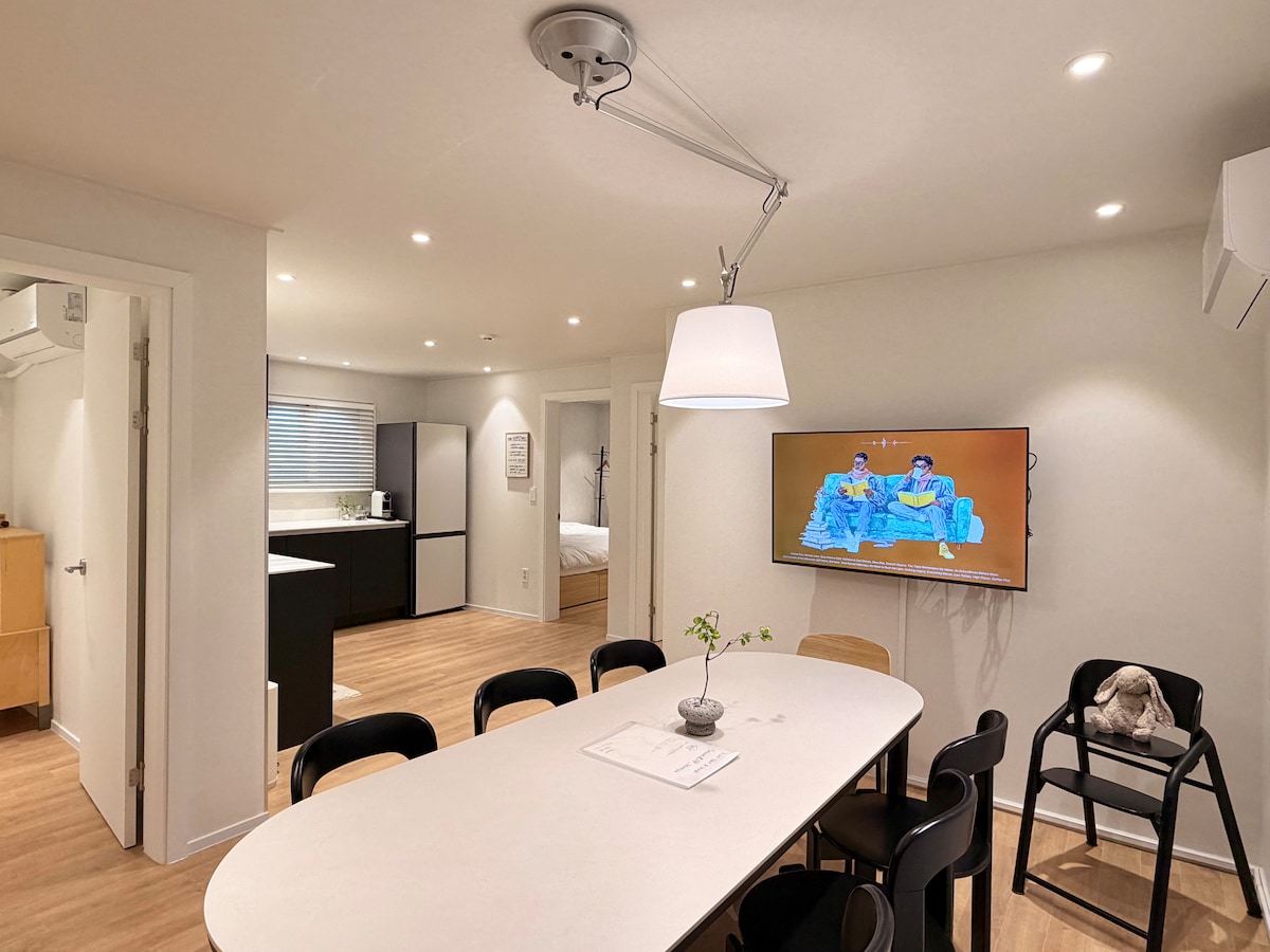 This new high-ceiling residence offers a panoramic view of the Han River and Bukhansan from about 48 meters above ground. The interior feels like a spacious modern apartment with clean, fresh facilities. Higher ceilings and new construction result in slightly higher rates. Convenience store on the 1st floor Discounted one-person desk in the 3rd-floor shared office (contact host). Reviews “Super clean with a beautiful, relaxing view.” “Amazing location and all appliances were brand-new.”