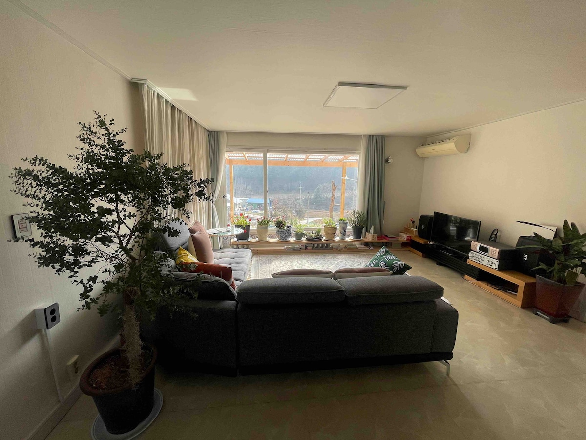 Es una casa de madera de 34 pyeong construida por la famosa compañía Rojas de una casa de campo rural, y el aislamiento es bueno y el aire en el alojamiento será agradable. Usando la ventana del sistema alemán (Eun Chang-ho), la habitación es fresca en verano, es cálida en invierno y el valle acuático de primera clase justo enfrente del alojamiento (400 pyeong) (además de la profundidad de los pechos adultos), parque acuático para niños pequeños, etc. Será un espacio donde realmente podrás relajarte y recargar tu energía lejos de la ciudad con flores y árboles de temporada bien mantenidos. * Hacer una hoguera con leña de roble, * Una copa de vino y Barbacoa de carbón (Hoengseongwoo, mariscos, etc.) * El sonido del agua curativa ASMR, * Jardín florido, * Paisajes nevados, * Observación de las estrellas de noche * Terraza llena de sol que canta el sonido de los pájaros... * Sauna finlandesa * Nuestro alojamiento tiene muchos huéspedes que lo visitan según la temporada. Hay algunas cosas que no se pueden capturar en las fotos, así que ven a disfrutarlas y sanar. ^ ^