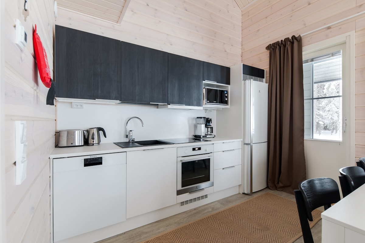 Villa Usva es un apartamento en el extremo de una casa adosada de madera (49 + 15 m²) en una ubicación céntrica, cerca de servicios y hermosas rutas al aire libre. Aquí podrá pasar unas maravillosas vacaciones con su familia o amigos. La cocina abierta de la planta baja - el salón crea ambiente y convivencia. La cabaña tiene un amplio altillo con camas para dos personas, y en el dormitorio de la planta baja caben cómodamente dos adultos. Encienda la chimenea por la noche, caliente la sauna y levante los pies. Se merece unas vacaciones.